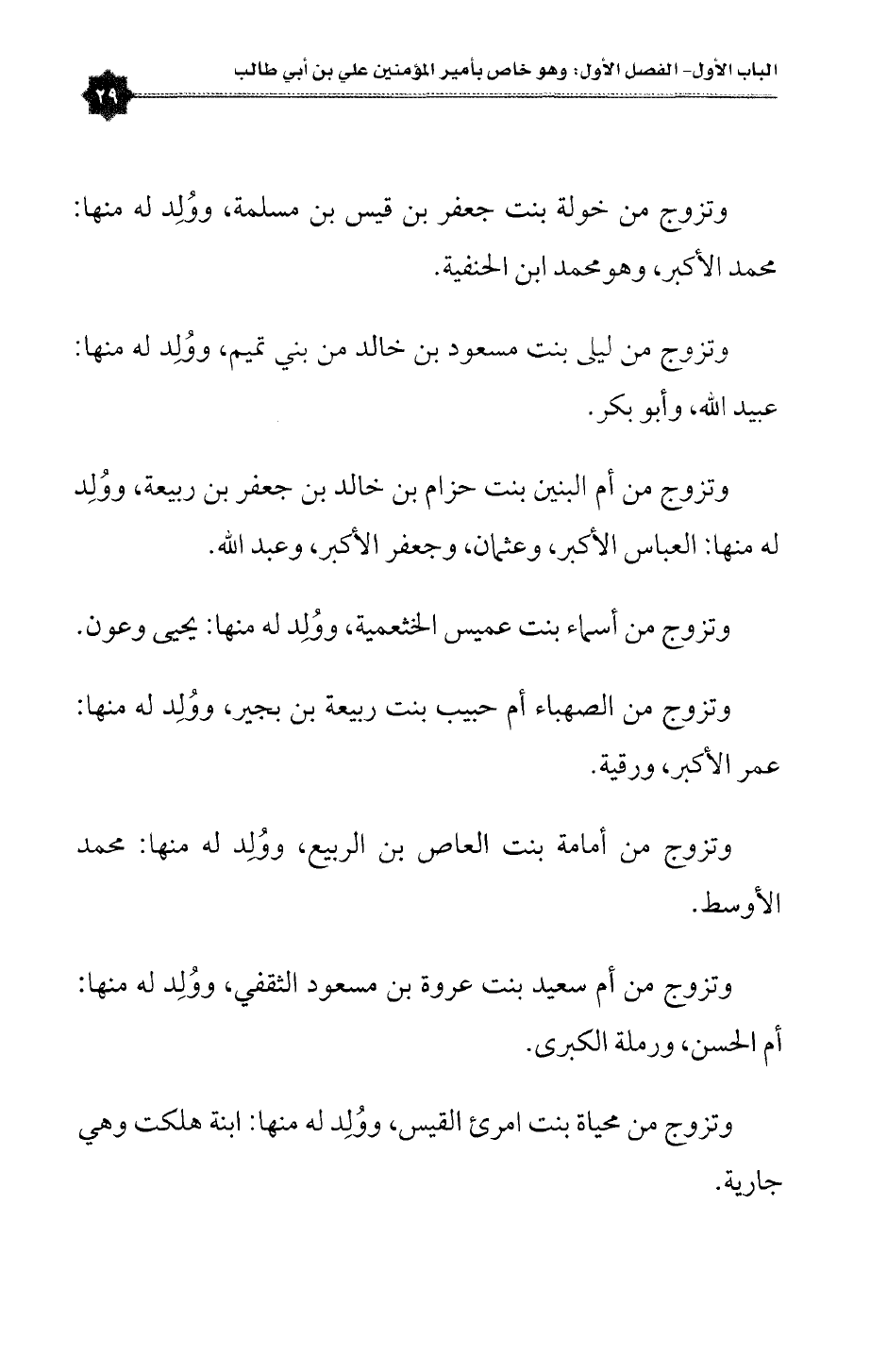 وتزوج من خولة بنت جعفر بن قيس بن مسلمة، ووُلِد له منها: محمد الأكبر، وهومحمد بن الحنفية.