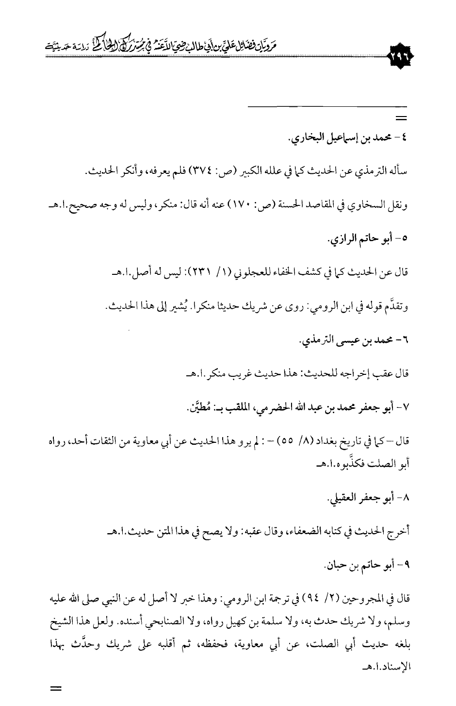 قال في المجروحين (٢/ ٩٤) في ترجمة ابن الرومي: وهذا خبر لا أصل له عن النبي صلى الله عليه وسلم، ولا شريك حدث به، ولا سلمة بن كهيل رواه، ولا الصنابحي أسنده. ولعل هذا الشيخ بلغه حديث أبي الصلت، عن أبي معاوية، فحفظه، ثم أقلبه على شريك وحدَّث بهذا الإسناد. ا. هـ =
