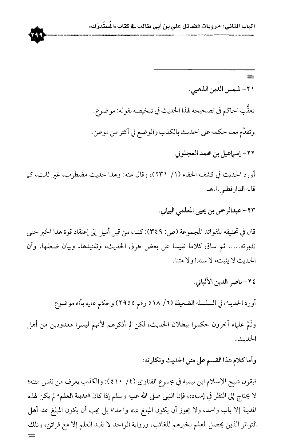 فيقول شيخ الإسلام ابن تيمية في مجموع الفتاوى (٤/ ٤١٠): والكذب يعرف من نفس متنه؛ لا يحتاج إلى النظر في إسناده، فإن النبي صلى الله عليه وسلم إذا كان «مدينة العلم» لم يكن لهذه المدينة إلا باب واحد، ولا يجوز أن يكون المبلغ عنه واحدا؛ بل يجب أن يكون المبلغ عنه أهل التواتر الذين يحصل العلم بخبرهم للغائب، ورواية الواحد لا تفيد العلم إلا مع قرائن، وتلك =