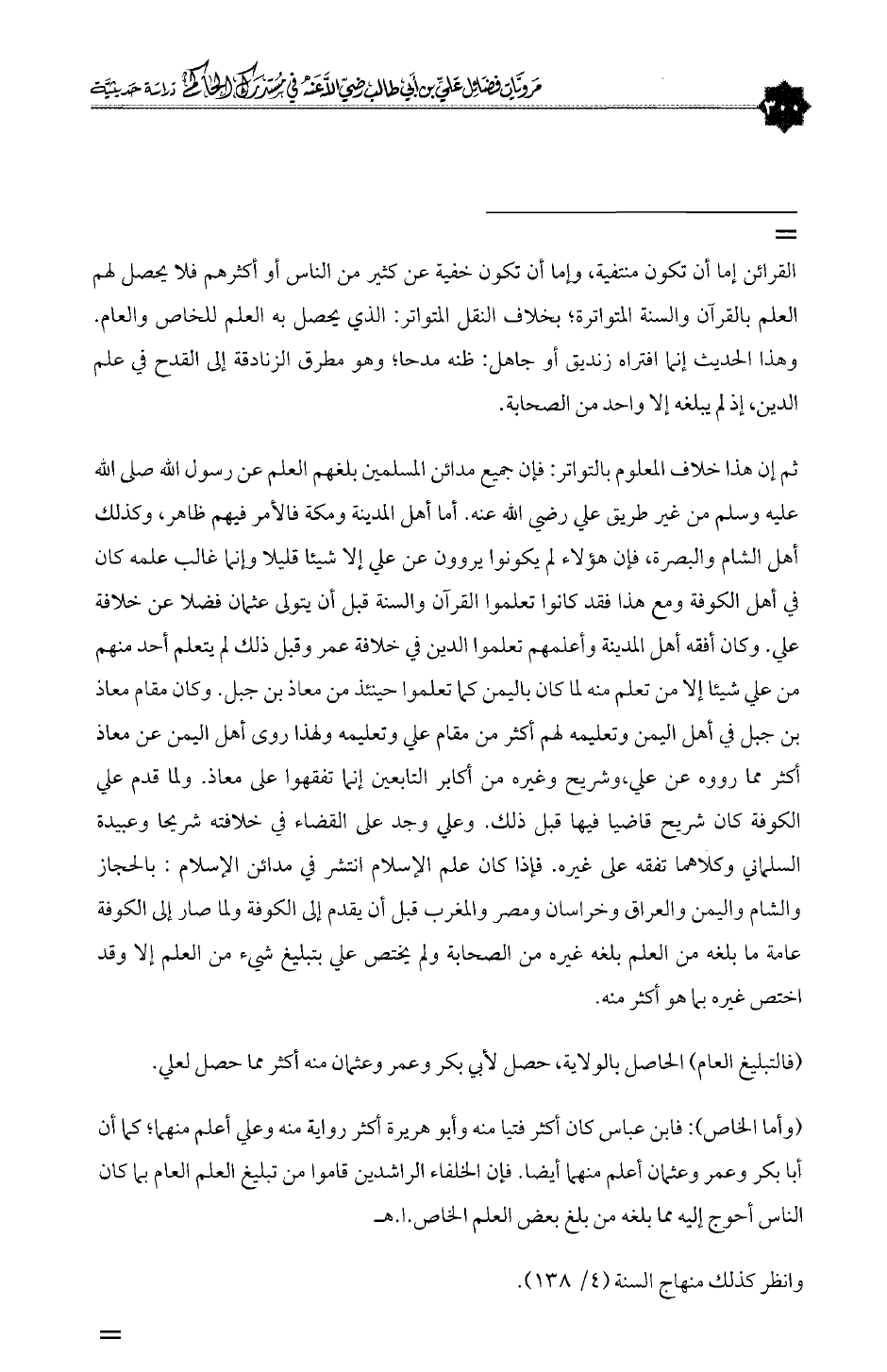 (وأما الخاص): فابن عباس كان أكثر فتيا منه وأبو هريرة أكثر رواية منه وعلي أعلم منهما؛ كما أن أبا بكر وعمر وعثمان أعلم منهما أيضا. فإن الخلفاء الراشدين قاموا من تبليغ العلم العام بما كان الناس أحوج إليه مما بلغه من بلغ بعض العلم الخاص. ا. هـ
