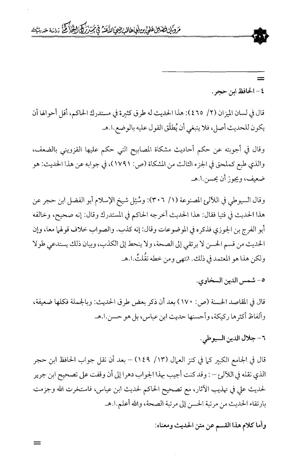 وقال السيوطي في اللآلئ المصنوعة (١/ ٣٠٦): وسُئِل شيخ الإسلام أبو الفضل ابن حجر عن هذا الحديث في فتيا فقال: هذا الحديث أخرجه الحاكم في المستدرك وقال: إنه صحيح، وخالفه أبو الفرج بن الجوزي فذكره في الموضوعات وقال: إنه كذب. والصواب خلاف قولهما معا، وإن الحديث من قسم الحسن لا يرتقي إلى الصحة، ولا ينحط إلى الكذب، وبيان ذلك يستدعي طولا ولكن هذا هو المعتمد في ذلك. انتهى ومن خطه نقُلتُ. ا. هـ