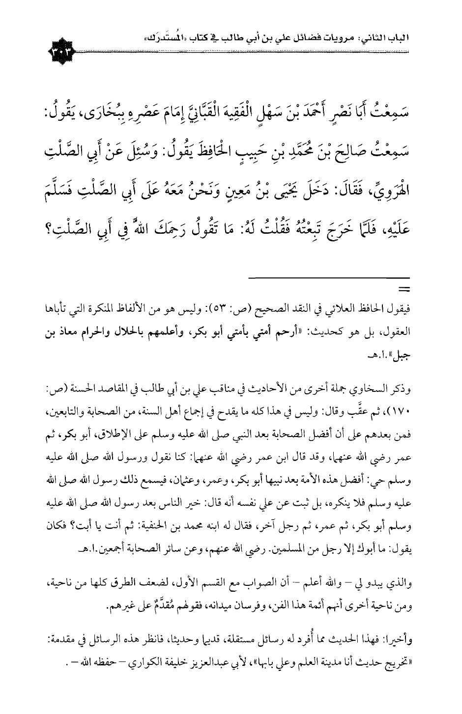 = فيقول الحافظ العلائي في النقد الصحيح (ص: ٥٣): وليس هو من الألفاظ المنكرة التي تأباها العقول، بل هو كحديث: «أرحم أمتي بأمتي أبو بكر، وأعلمهم بالحلال والحرام معاذ بن جبل».ا. هـ