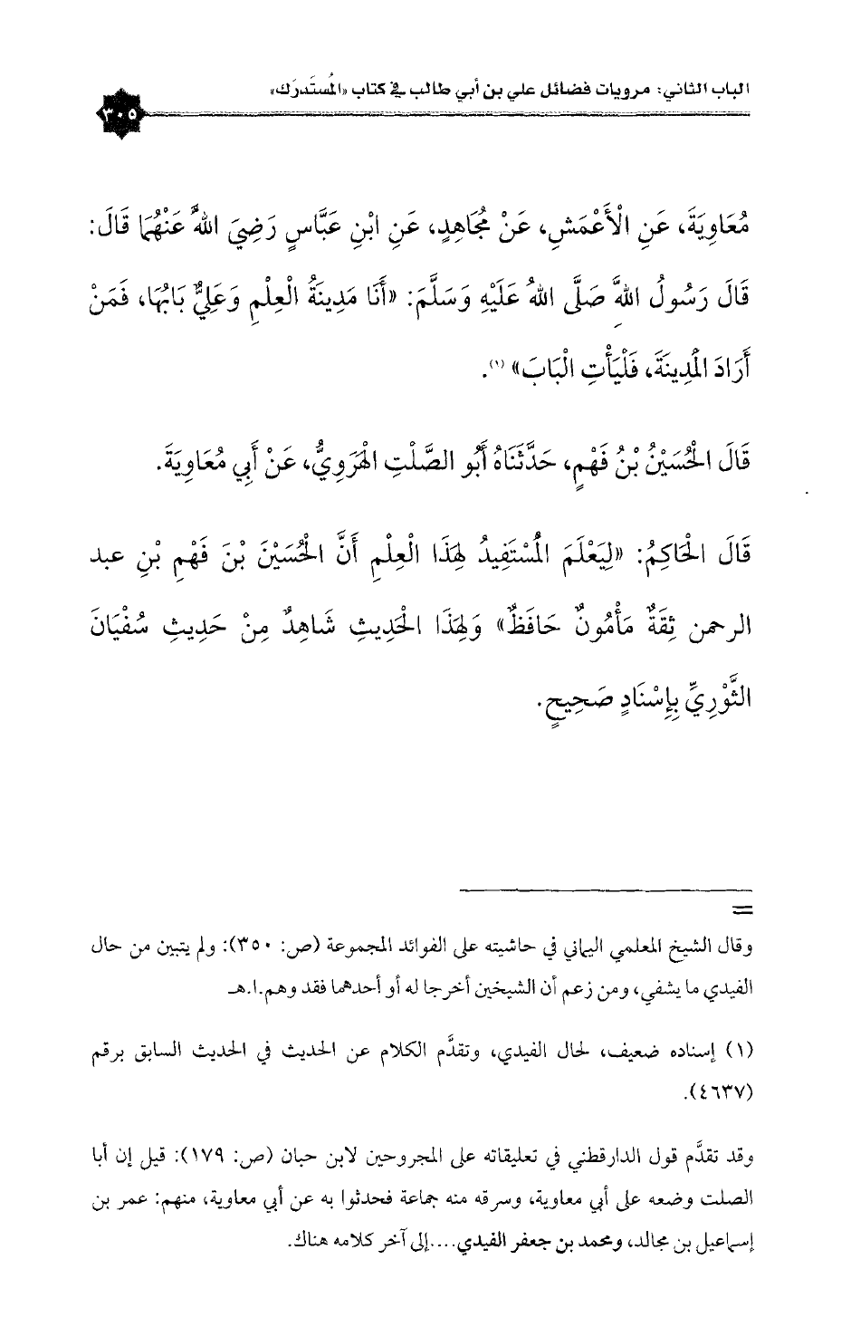 مُعَاوِيَةَ، عَنِ الْأَعْمَشِ، عَنْ مُجَاهِدٍ، عَنِ ابْنِ عَبَّاسٍ رَضِيَ اللَّهُ عَنْهُمَا قَالَ: قَالَ رَسُولُ اللَّهِ صَلَّى اللهُ عَلَيْهِ وَسَلَّمَ: «أَنَا مَدِينَةُ الْعِلْمِ وَعَلِيٌّ بَابُهَا، فَمَنْ أَرَادَ الْمَدِينَةَ، فَلْيَأْتِ الْبَابَ» (¬١).