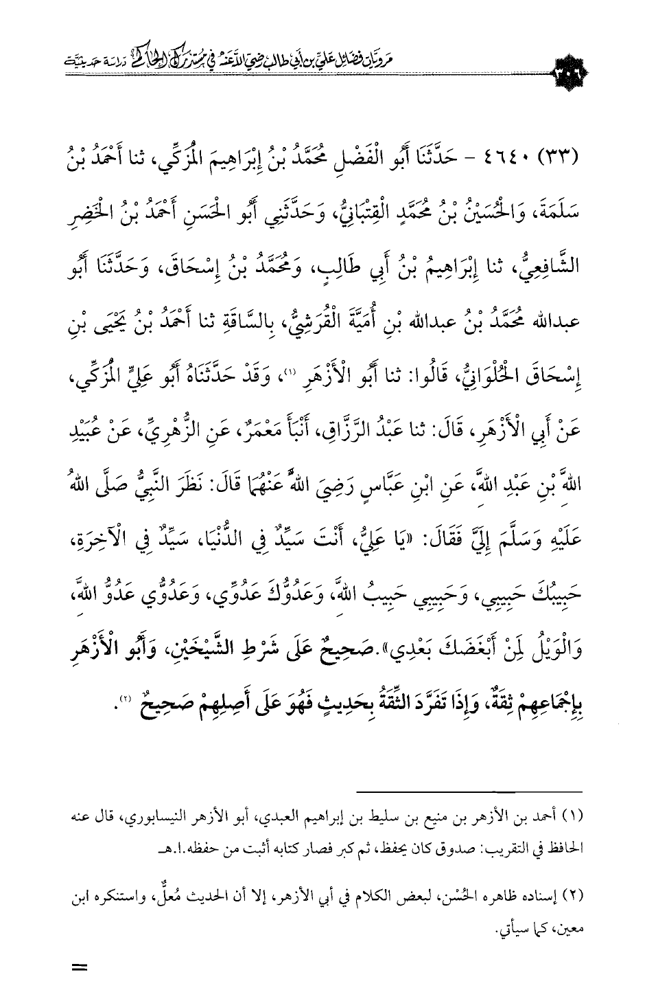 (٣٣) ٤٦٤٠ - حَدَّثَنَا أَبُو الْفَضْلِ مُحَمَّدُ بْنُ إِبْرَاهِيمَ الْمُزَكِّي، ثنا أَحْمَدُ بْنُ سَلَمَةَ، وَالْحُسَيْنُ بْنُ مُحَمَّدٍ الْقِتْبَانِيُّ، وَحَدَّثَنِي أَبُو الْحَسَنِ أَحْمَدُ بْنُ الْخَضِرِ الشَّافِعِيُّ، ثنا إِبْرَاهِيمُ بْنُ أَبِي طَالِبٍ، وَمُحَمَّدُ بْنُ إِسْحَاقَ، وَحَدَّثَنَا أَبُو عبدالله مُحَمَّدُ بْنُ عبدالله بْنِ أُمَيَّةَ الْقُرَشِيُّ، بِالسَّاقَةِ ثنا أَحْمَدُ بْنُ يَحْيَى بْنِ إِسْحَاقَ الْحُلْوَانِيُّ، قَالُوا: ثنا أَبُو الْأَزْهَرِ (¬١)، وَقَدْ حَدَّثَنَاهُ أَبُو عَلِيٍّ الْمُزَكِّي، عَنْ أَبِي الْأَزْهَرِ، قَالَ: ثنا عَبْدُالرَّزَّاقِ، أَنْبَأَ مَعْمَرٌ، عَنِ الزُّهْرِيِّ، عَنْ عُبَيْدِاللَّهِ بْنِ عَبْدِاللَّهِ، عَنِ ابْنِ عَبَّاسٍ رَضِيَ اللَّهُ عَنْهُمَا قَالَ: نَظَرَ النَّبِيُّ صَلَّى اللهُ عَلَيْهِ وَسَلَّمَ إِلَيَّ فَقَالَ: «يَا عَلِيُّ، أَنْتَ سَيِّدٌ فِي الدُّنْيَا، سَيِّدٌ فِي الْآخِرَةِ، حَبِيبُكَ حَبِيبِي، وَحَبِيبِي حَبِيبُ اللَّهِ، وَعَدُوُّكَ عَدُوِّي، وَعَدُوُّي عَدُوُّ اللَّهِ، وَالْوَيْلُ لِمَنْ أَبْغَضَكَ بَعْدِي». صَحِيحٌ عَلَى شَرْطِ الشَّيْخَيْنِ، وَأَبُو الْأَزْهَرِ بِإِجْمَاعِهِمْ ثِقَةٌ، وَإِذَا تَفَرَّدَ الثِّقَةُ بِحَدِيثٍ فَهُوَ عَلَى أَصِلِهِمْ صَحِيحٌ (¬٢).