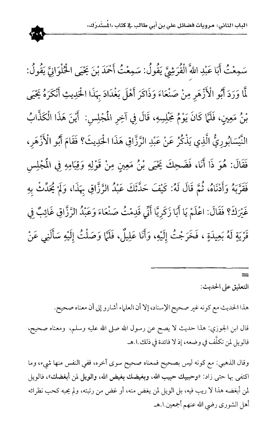 وقال الذهبي: مع كونه ليس بصحيح فمعناه صحيح سوى آخره، ففي النفس منها شيء، وما اكتفى بها حتى زاد: «وحبيبك حبيب الله، وبغيضك بغيض الله، والويل لمن أبغضك»، فالويل لمن أبغضه هذا لا ريب فيه، بل الويل لمن يغض منه، أو غض من رتبته، ولم يحبه كحب نظرائه أهل الشورى رضي الله عنهم أجمعين. ا. هـ