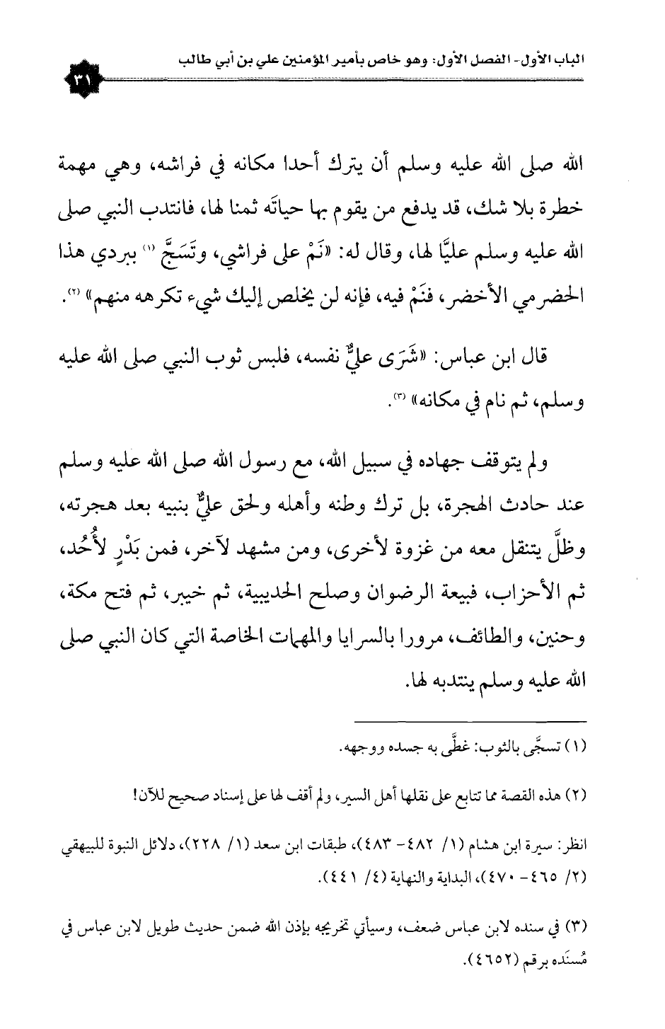 قال ابن عباس: «شَرَى عليٌّ نفسه، فلبس ثوب النبي صلى الله عليه وسلم، ثم نام في مكانه» (¬٣).