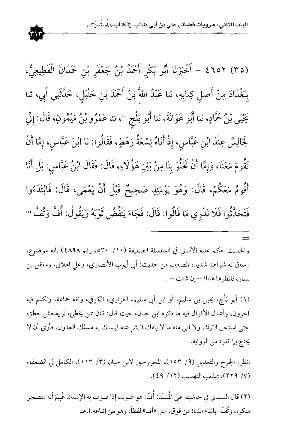 (٣٥) ٤٦٥٢ - أَخْبَرَنَا أَبُو بَكْرٍ أَحْمَدُ بْنُ جَعْفَرِ بْنِ حَمْدَانَ الْقَطِيعِيُّ، بِبَغْدَادَ مِنْ أَصْلِ كِتَابِهِ، ثنا عَبْدُاللَّهِ بْنُ أَحْمَدَ بْنِ حَنْبَلٍ، حَدَّثَنِي أَبِي، ثنا يَحْيَى بْنُ حَمَّادٍ، ثنا أَبُو عَوَانَةَ، ثنا أَبُو بَلْجٍ (¬١)، ثنا عَمْرُو بْنُ مَيْمُونٍ، قَالَ: إِنِّي لَجَالِسٌ عِنْدَ ابْنِ عَبَّاسٍ، إِذْ أَتَاهُ تِسْعَةُ رَهْطٍ، فَقَالُوا: يَا ابْنَ عَبَّاسٍ، إِمَّا أَنْ تَقُومَ مَعَنَا، وَإِمَّا أَنْ تَخْلُوَ بِنَا مِنْ بَيْنِ هَؤُلَاءِ، قَالَ: فَقَالَ ابْنُ عَبَّاسٍ: بَلْ أَنَا أَقُومُ مَعَكُمْ، قَالَ: وَهُوَ يَوْمَئِذٍ صَحِيحٌ قَبْلَ أَنْ يَعْمَى، قَالَ: فَابْتَدَءُوا فَتَحَدَّثُوا فَلَا نَدْرِي مَا قَالُوا: قَالَ: فَجَاءَ يَنْفُضُ ثَوْبَهُ وَيَقُولُ: أُفٍّ وَتُفٍّ (¬٢)