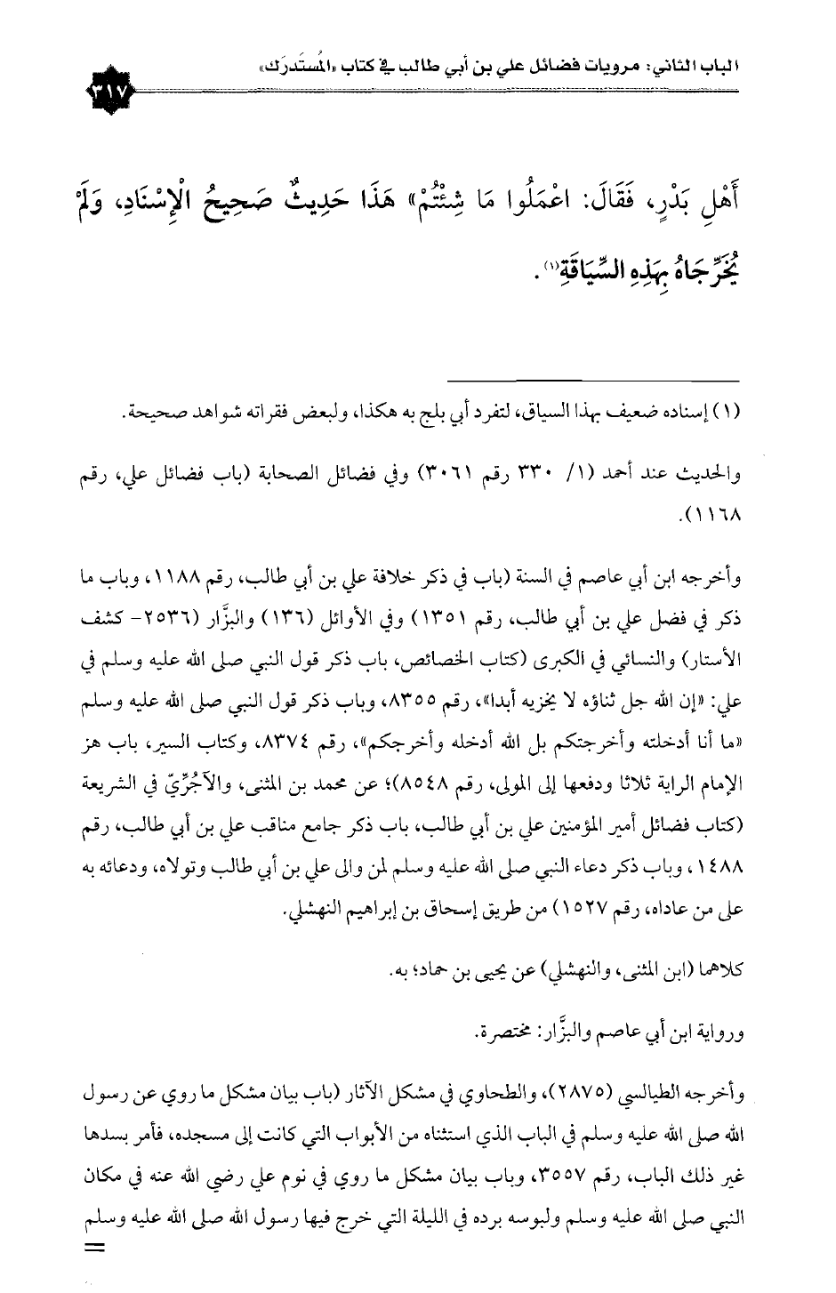 وأخرجه الطيالسي (٢٨٧٥)، والطحاوي في مشكل الآثار (باب بيان مشكل ما روي عن رسول الله صلى الله عليه وسلم في الباب الذي استثناه من الأبواب التي كانت إلى مسجده، فأمر بسدها غير ذلك الباب، رقم ٣٥٥٧، وباب بيان مشكل ما روي في نوم علي رضي الله عنه في مكان النبي صلى الله عليه وسلم ولبوسه برده في الليلة التي خرج فيها رسول الله صلى الله عليه وسلم =