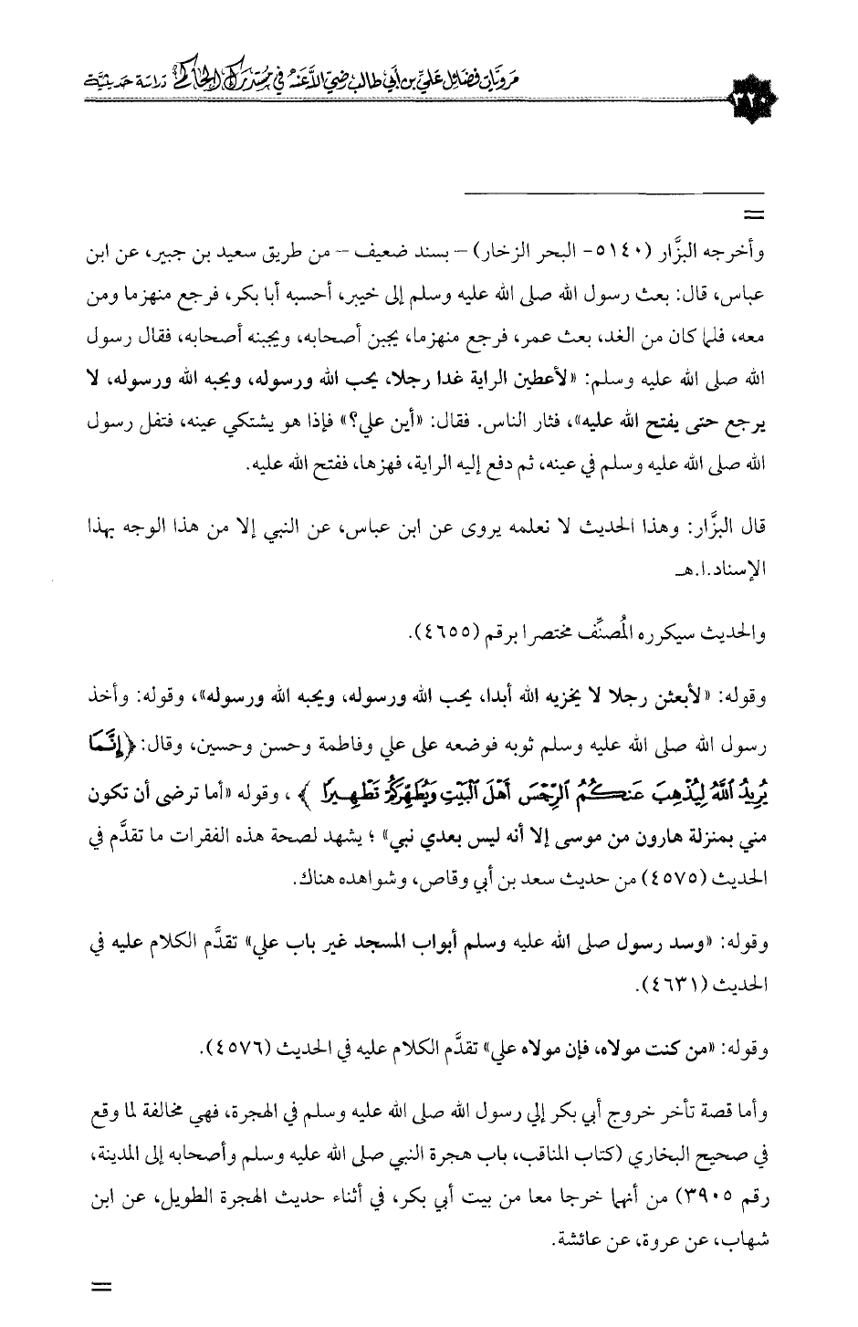 وقوله: «لأبعثن رجلا لا يخزيه الله أبدا، يحب الله ورسوله، ويحبه الله ورسوله»، وقوله: وأخذ رسول الله صلى الله عليه وسلم ثوبه فوضعه على علي وفاطمة وحسن وحسين، وقال: {إنما يريد الله ليذهب عنكم الرجس أهل البيت ويطهركم تطهيرا}، وقوله «أما ترضى أن تكون مني بمنزلة هارون من موسى إلا أنه ليس بعدي نبي»؛ يشهد لصحة هذه الفقرات ما تقدَّم في الحديث (٤٥٧٥) من حديث سعد بن أبي وقاص، وشواهده هناك.