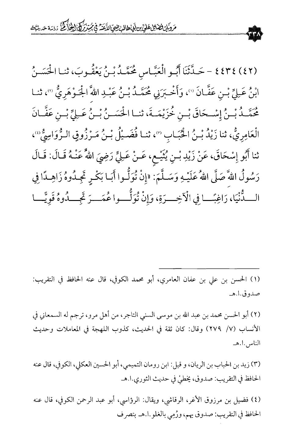 (٤٢) ٤٤٣٤ - حَدَّثَنَا أَبُو الْعَبَّاسِ مُحَمَّدُ بْنُ يَعْقُوبَ، ثنا الْحَسَنُ بْنُ عَلِيِّ بْنِ عَفَّانَ (¬١)، وَأَخْبَرَنِي مُحَمَّدُ بْنُ عَبْدِاللَّهِ الْجَوْهَرِيُّ (¬٢)، ثنا مُحَمَّدُ بْنُ إِسْحَاقَ بْنِ خُزَيْمَةَ، ثنا الْحَسَنُ بْنُ عَلِيِّ بْنِ عَفَّانَ الْعَامِرِيُّ، ثنا زَيْدُ بْنُ الْحُبَابِ (¬٣)، ثنا فُضَيْلُ بْنُ مَرْزُوقٍ الرُّوَاسِيُّ (¬٤)، ثنا أَبُو إِسْحَاقَ، عَنْ زَيْدِ بْنِ يُثَيْعٍ، عَنْ عَلِيٍّ رَضِيَ اللَّهُ عَنْهُ قَالَ: قَالَ رَسُولُ اللَّهِ صَلَّى اللهُ عَلَيْهِ وَسَلَّمَ: «إِنْ تُوَلُّوا أَبَا بَكْرٍ تَجِدُوهُ زَاهِدًا فِي الدُّنْيَا، رَاغِبًا فِي الْآخِرَةِ، وَإِنْ تُوَلُّوا عُمَرَ تَجِدُوهُ قَوِيًّا