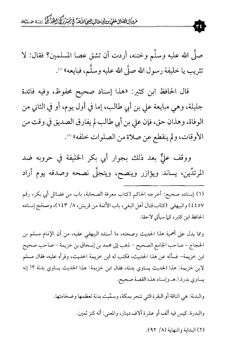 قال الحافظ ابن كثير: «هذا إسناد صحيح محفوظ، وفيه فائدة جليلة، وهي مبايعة علي بن أبي طالب، إما في أول يوم، أو في الثاني من الوفاة، وهذان حق، فإن علي بن أبي طالب لم يفارق الصديق في وقت من الأوقات، ولم ينقطع عن صلاة من الصلوات خلفه» (¬٢).