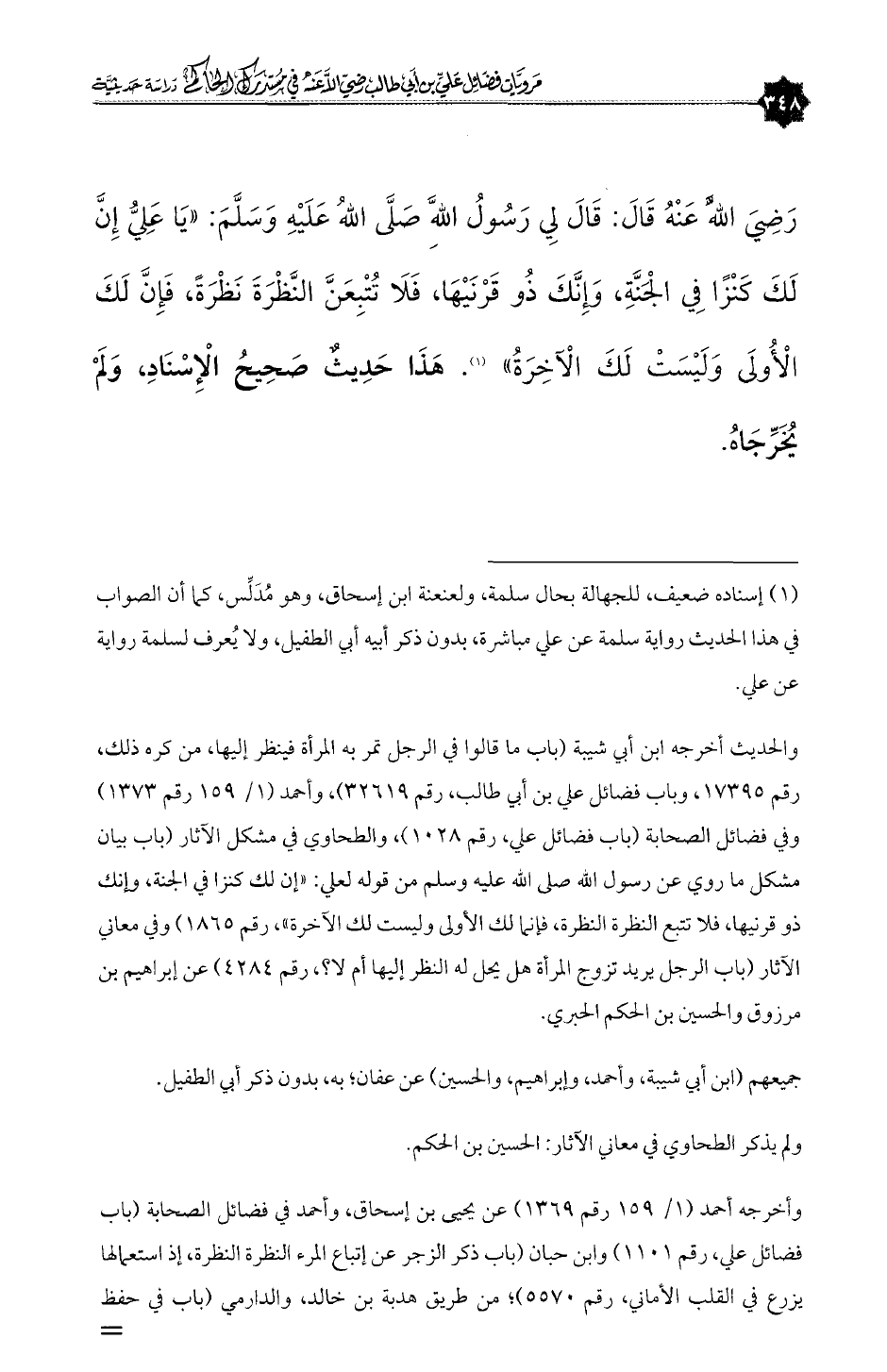 والحديث أخرجه ابن أبي شيبة (باب ما قالوا في الرجل تمر به المرأة فينظر إليها، من كره ذلك، رقم ١٧٣٩٥، وباب فضائل علي بن أبي طالب، رقم ٣٢٦١٩)، وأحمد (١/ ١٥٩ رقم ١٣٧٣) وفي فضائل الصحابة (باب فضائل علي، رقم ١٠٢٨)، والطحاوي في مشكل الآثار (باب بيان مشكل ما روي عن رسول الله صلى الله عليه وسلم من قوله لعلي: «إن لك كنزا في الجنة، وإنك ذو قرنيها، فلا تتبع النظرة النظرة، فإنما لك الأولى وليست لك الآخرة»، رقم ١٨٦٥) وفي معاني الآثار (باب الرجل يريد تزوج المرأة هل يحل له النظر إليها أم لا؟، رقم ٤٢٨٤) عن إبراهيم بن مرزوق والحسين بن الحكم الحبري.