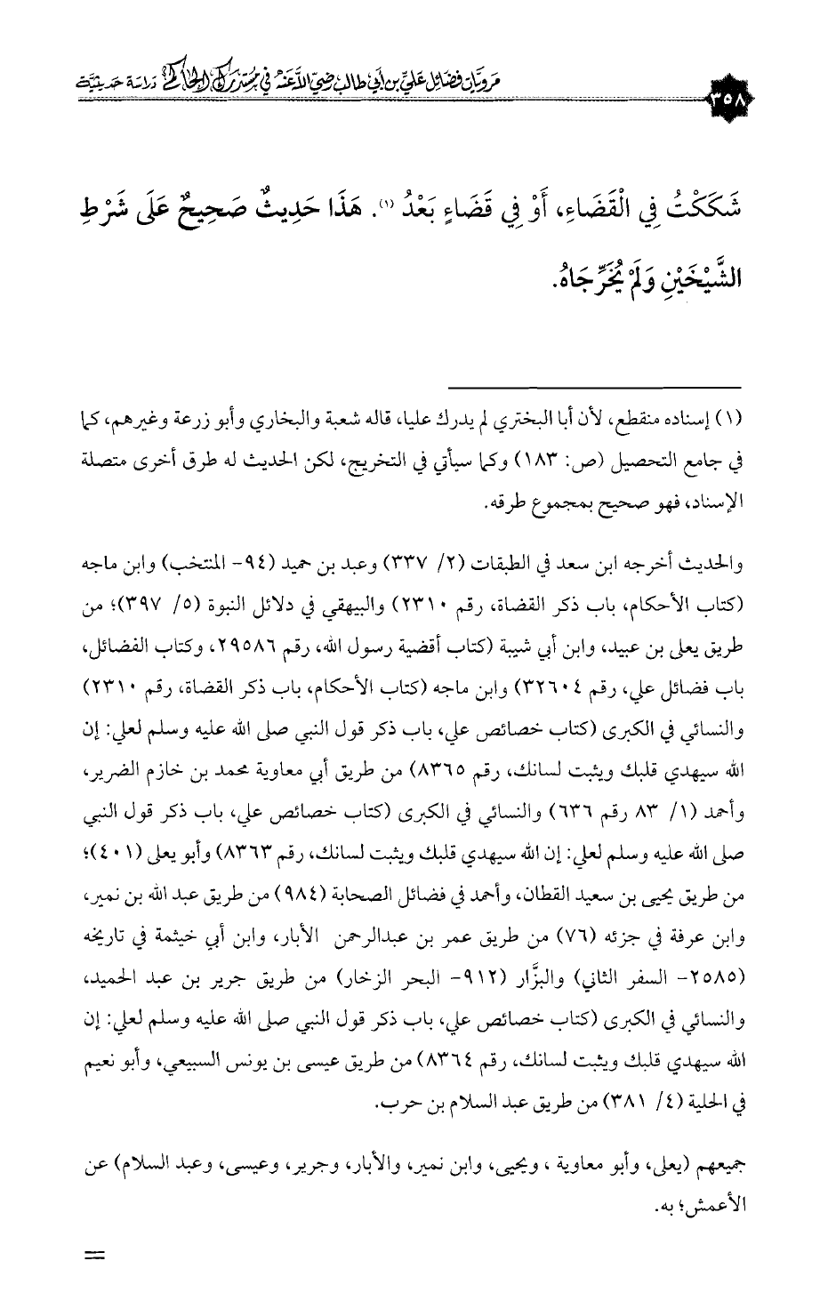 والحديث أخرجه ابن سعد في الطبقات (٢/ ٣٣٧) وعبد بن حميد (٩٤ - المنتخب) وابن ماجه (كتاب الأحكام، باب ذكر القضاة، رقم ٢٣١٠) والبيهقي في دلائل النبوة (٥/ ٣٩٧)؛ من طريق يعلى بن عبيد، وابن أبي شيبة (كتاب أقضية رسول الله، رقم ٢٩٥٨٦، وكتاب الفضائل، باب فضائل علي، رقم ٣٢٦٠٤) وابن ماجه (كتاب الأحكام، باب ذكر القضاة، رقم ٢٣١٠) والنسائي في الكبرى (كتاب خصائص علي، باب ذكر قول النبي صلى الله عليه وسلم لعلي: إن الله سيهدي قلبك ويثبت لسانك، رقم ٨٣٦٥) من طريق أبي معاوية محمد بن خازم الضرير، وأحمد (١/ ٨٣ رقم ٦٣٦) والنسائي في الكبرى (كتاب خصائص علي، باب ذكر قول النبي صلى الله عليه وسلم لعلي: إن الله سيهدي قلبك ويثبت لسانك، رقم ٨٣٦٣) وأبو يعلى (٤٠١)؛ من طريق يحيى بن سعيد القطان، وأحمد في فضائل الصحابة (٩٨٤) من طريق عبدالله بن نمير، وابن عرفة في جزئه (٧٦) من طريق عمر بن عبدالرحمن الأبار، وابن أبي خيثمة في تاريخه (٢٥٨٥ - السفر الثاني) والبزَّار (٩١٢ - البحر الزخار) من طريق جرير بن عبدالحميد، والنسائي في الكبرى (كتاب خصائص علي، باب ذكر قول النبي صلى الله عليه وسلم لعلي: إن الله سيهدي قلبك ويثبت لسانك، رقم ٨٣٦٤) من طريق عيسى بن يونس السبيعي، وأبو نعيم في الحلية (٤/ ٣٨١) من طريق عبدالسلام بن حرب.