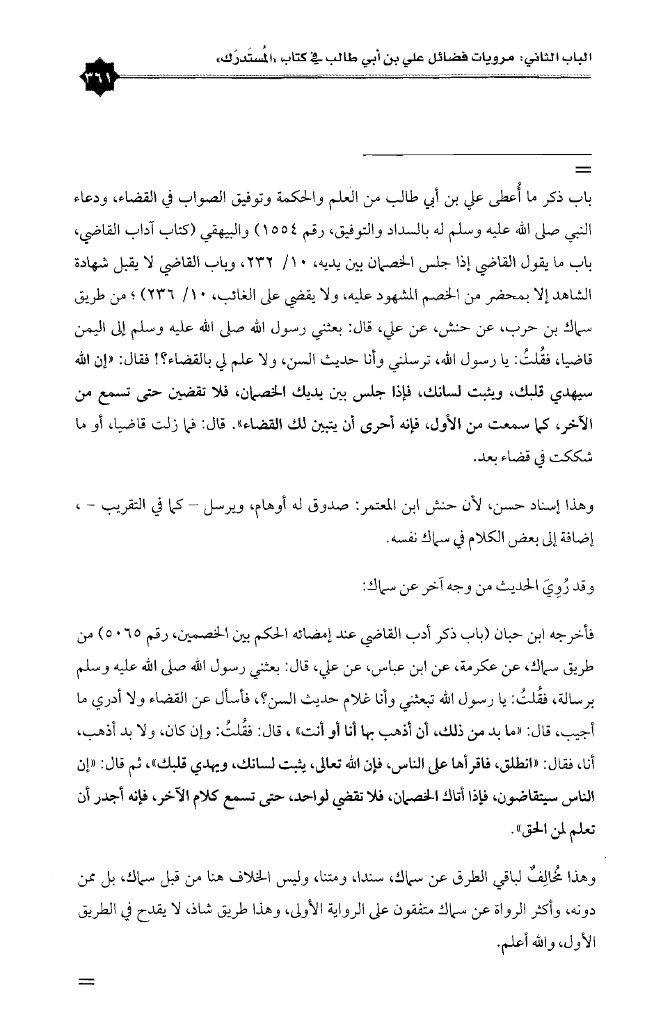 = باب ذكر ما أُعطى علي بن أبي طالب من العلم والحكمة وتوفيق الصواب في القضاء، ودعاء النبي صلى الله عليه وسلم له بالسداد والتوفيق، رقم ١٥٥٤) والبيهقي (كتاب آداب القاضي، باب ما يقول القاضي إذا جلس الخصمان بين يديه، ١٠/ ٢٣٢، وباب القاضي لا يقبل شهادة الشاهد إلا بمحضر من الخصم المشهود عليه، ولا يقضي على الغائب، ١٠/ ٢٣٦)؛ من طريق سماك بن حرب، عن حنش، عن علي، قال: بعثني رسول الله صلى الله عليه وسلم إلى اليمن قاضيا، فقُلتُ: يا رسول الله، ترسلني وأنا حديث السن، ولا علم لي بالقضاء؟! فقال: «إن الله سيهدي قلبك، ويثبت لسانك، فإذا جلس بين يديك الخصمان، فلا تقضين حتى تسمع من الآخر، كما سمعت من الأول، فإنه أحرى أن يتبين لك القضاء». قال: فما زلت قاضيا، أو ما شككت في قضاء بعد.
