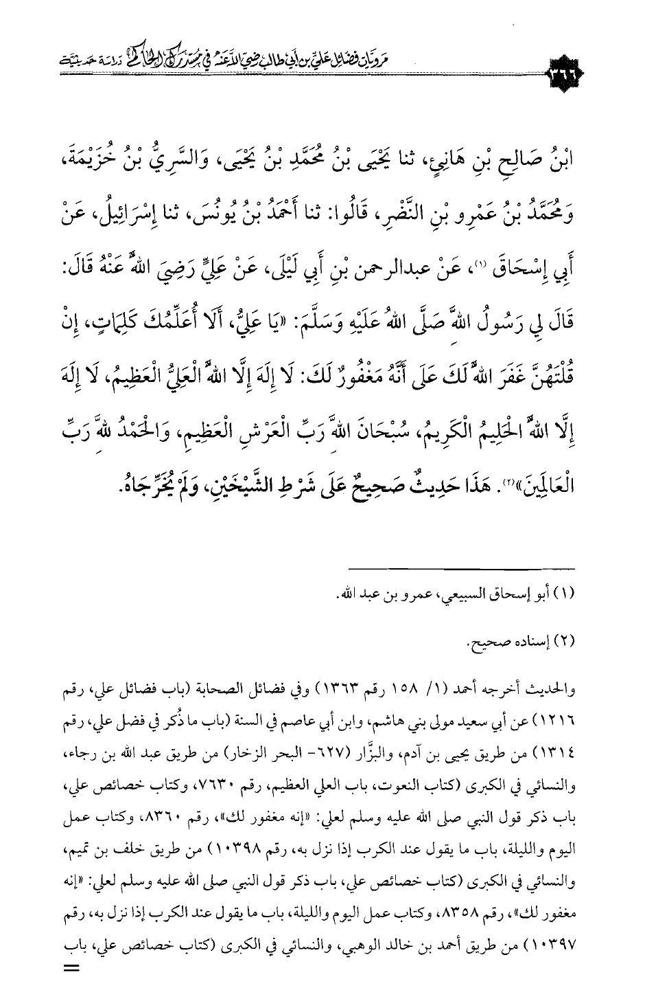 بْنُ صَالِحِ بْنِ هَانِئٍ، ثنا يَحْيَى بْنُ مُحَمَّدِ بْنُ يَحْيَى، وَالسَّرِيُّ بْنُ خُزَيْمَةَ، وَمُحَمَّدُ بْنُ عَمْرِو بْنِ النَّضْرِ، قَالُوا: ثنا أَحْمَدُ بْنُ يُونُسَ، ثنا إِسْرَائِيلُ، عَنْ أَبِي إِسْحَاقَ (¬١)، عَنْ عبدالرحمن بْنِ أَبِي لَيْلَى، عَنْ عَلِيٍّ رَضِيَ اللَّهُ عَنْهُ قَالَ: قَالَ لِي رَسُولُ اللَّهِ صَلَّى اللهُ عَلَيْهِ وَسَلَّمَ: «يَا عَلِيُّ، أَلَا أُعَلِّمُكَ كَلِمَاتٍ، إِنْ قُلْتَهُنَّ غَفَرَ اللَّهُ لَكَ عَلَى أَنَّهُ مَغْفُورٌ لَكَ: لَا إِلَهَ إِلَّا اللَّهُ الْعَلِيُّ الْعَظِيمُ، لَا إِلَهَ إِلَّا اللَّهُ الْحَلِيمُ الْكَرِيمُ، سُبْحَانَ اللَّهِ رَبِّ الْعَرْشِ الْعَظِيمِ، وَالْحَمْدُ لِلَّهِ رَبِّ الْعَالَمِينَ» (¬٢).
