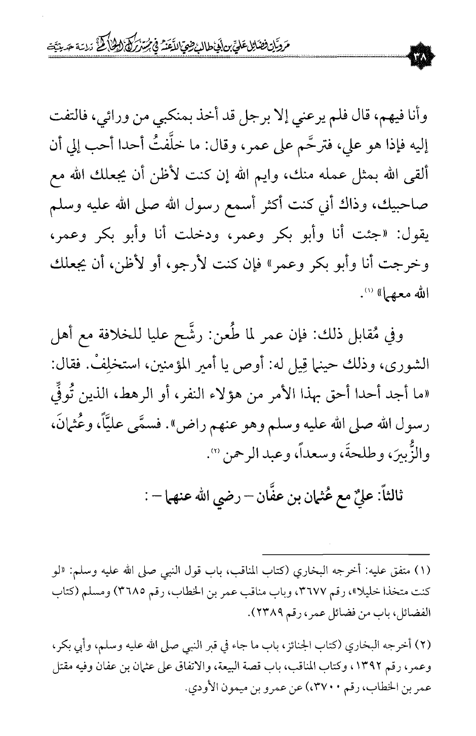 (¬٢) أخرجه البخاري (كتاب الجنائز، باب ما جاء في قبر النبي صلى الله عليه وسلم، وأبي بكر، وعمر، رقم ١٣٩٢، وكتاب المناقب، باب قصة البيعة، والاتفاق على عثمان بن عفان وفيه مقتل عمر بن الخطاب، رقم ٣٧٠٠،) عن عمرو بن ميمون الأودي.