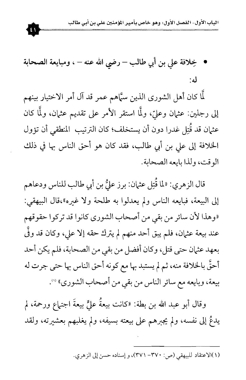 وقال أبو عبدالله بن بطة: «كانت بيعةُ عليٍّ بيعةَ اجتماع ورحمة، لم يدعُ إلى نفسه، ولم يجبرهم على بيعته بسيفه، ولم يغلبهم بعشيرته، ولقد