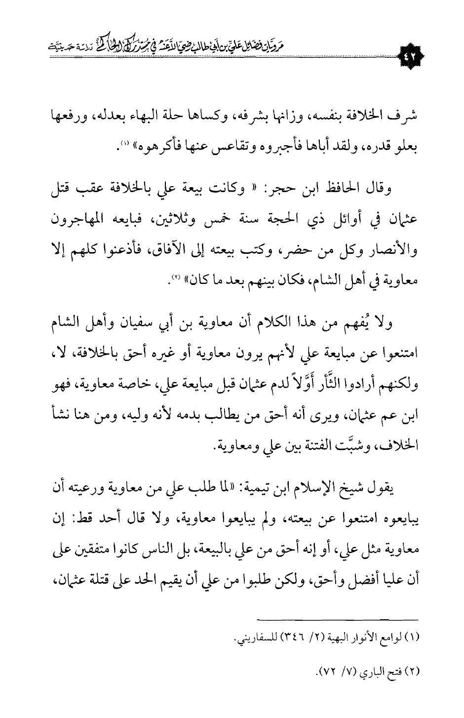 ولا يُفهم من هذا الكلام أن معاوية بن أبي سفيان وأهل الشام امتنعوا عن مبايعة علي لأنهم يرون معاوية أو غيره أحق بالخلافة، لا، ولكنهم أرادوا الثَّأر أَوَّلاً لدم عثمان قبل مبايعة علي، خاصة معاوية، فهو ابن عم عثمان، ويرى أنه أحق من يطالب بدمه لأنه وليه، ومن هنا نشأ الخلاف، وشبَّت الفتنة بين علي ومعاوية.