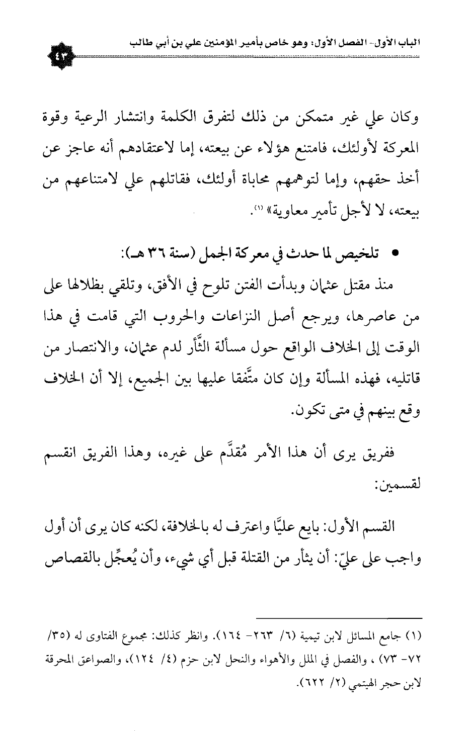 وكان علي غير متمكن من ذلك لتفرق الكلمة وانتشار الرعية وقوة المعركة لأولئك، فامتنع هؤلاء عن بيعته، إما لاعتقادهم أنه عاجز عن أخذ حقهم، وإما لتوهمهم محاباة أولئك، فقاتلهم علي لامتناعهم من بيعته، لا لأجل تأمير معاوية» (¬١).