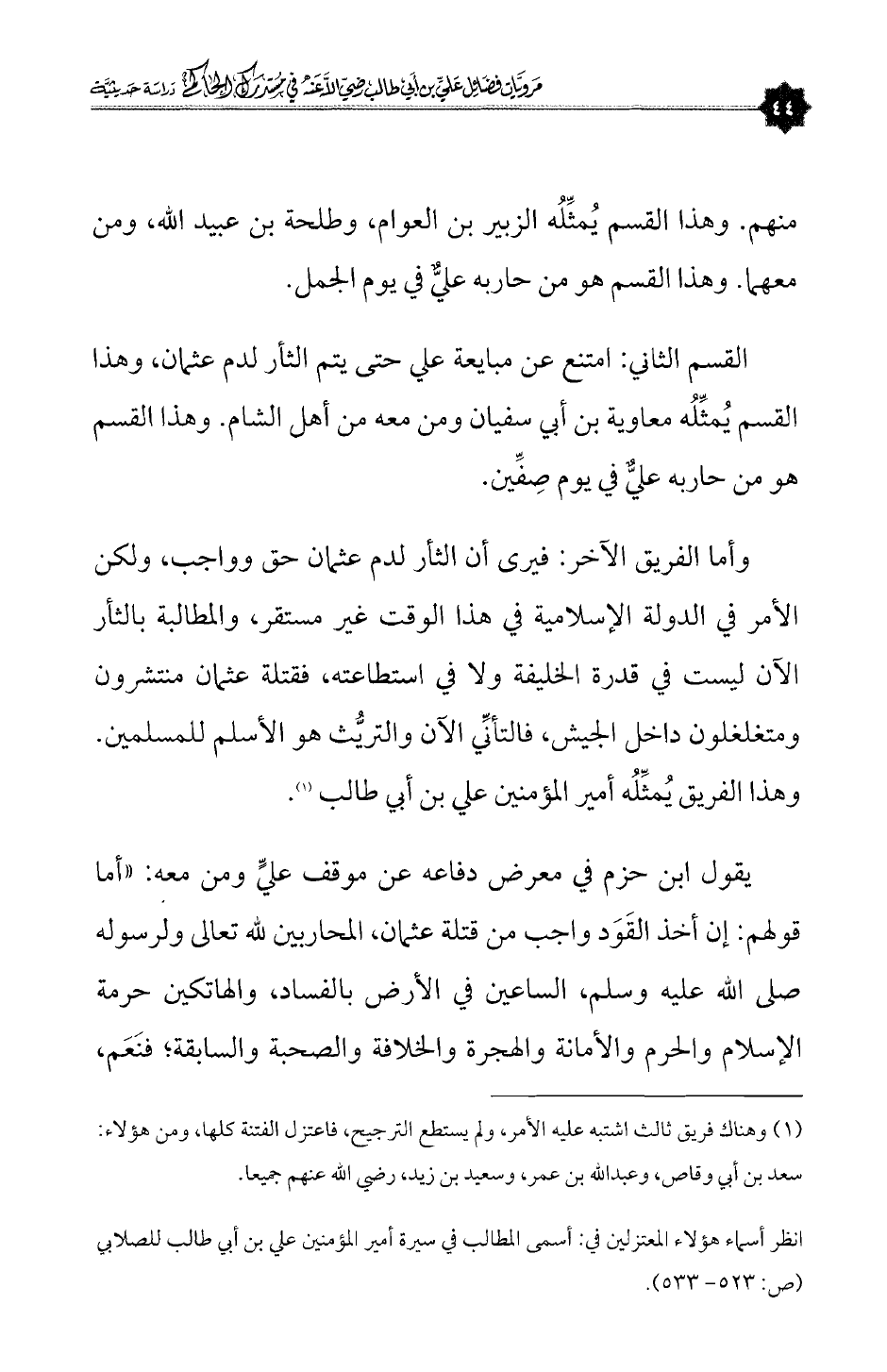(¬١) وهناك فريق ثالث اشتبه عليه الأمر، ولم يستطع الترجيح، فاعتزل الفتنة كلها، ومن هؤلاء: سعد بن أبي وقاص، وعبدالله بن عمر، وسعيد بن زيد، رضي الله عنهم جميعا.