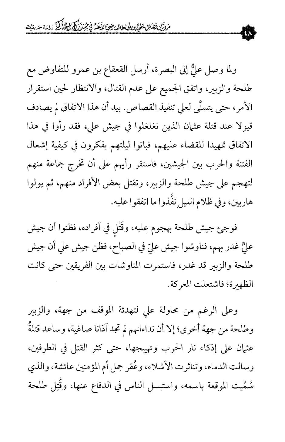 وعلى الرغم من محاولة علي لتهدئة الموقف من جهة، والزبير وطلحة من جهة أخرى؛ إلا أن نداءاتهم لم تجد آذانا صاغية، وساعد قتلةُ عثمان على إذكاء نار الحرب وتهييجها، حتى كثر القتل في الطرفين، وسالت الدماء، وتناثرت الأشلاء، وعُقر جمل أم المؤمنين عائشة، والذي سُمِّيت الموقعة باسمه، واستبسل الناس في الدفاع عنها، وقُتِل طلحة