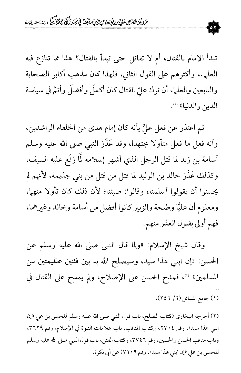 تبدأ الإمام بالقتال، أم لا تقاتل حتى تبدأ بالقتال؟ هذا مما تنازع فيه العلماء، وأكثرهم على القول الثاني، فلهذا كان مذهب أكابر الصحابة والتابعين والعلماء أن ترك عليّ القتال كان أكملَ وأفضلَ وأتمَّ في سياسة الدين والدنيا» (¬١).