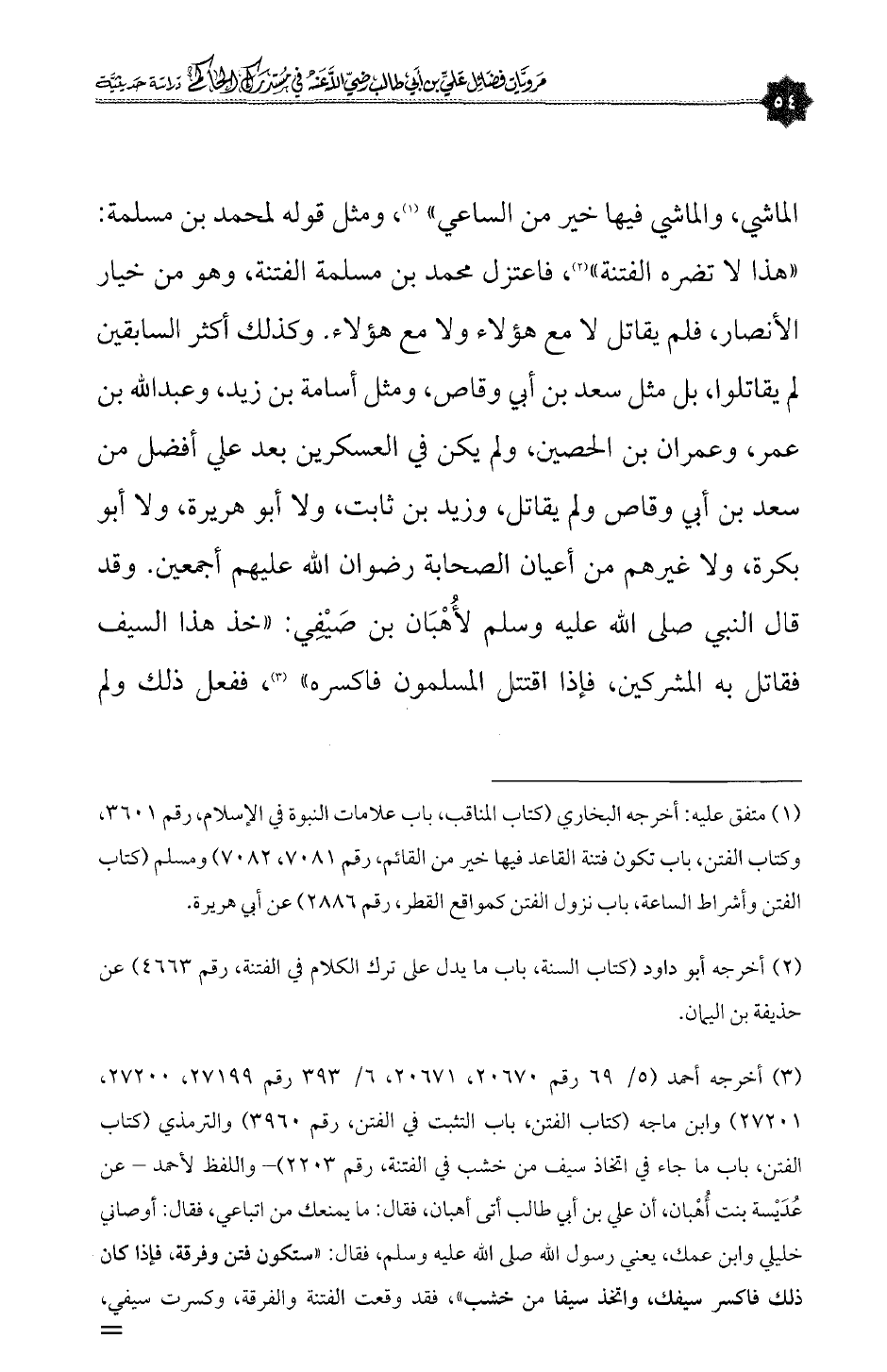 (¬٣) أخرجه أحمد (٥/ ٦٩ رقم ٢٠٦٧٠، ٢٠٦٧١، ٦/ ٣٩٣ رقم ٢٧١٩٩، ٢٧٢٠٠، ٢٧٢٠١) وابن ماجه (كتاب الفتن، باب التثبت في الفتن، رقم ٣٩٦٠) والترمذي (كتاب الفتن، باب ما جاء في اتخاذ سيف من خشب في الفتنة، رقم ٢٢٠٣) - واللفظ لأحمد - عن عُدَيْسة بنت أُهْبان، أن علي بن أبي طالب أتى أهبان، فقال: ما يمنعك من اتباعي، فقال: أوصاني خليلي وابن عمك، يعني رسول الله صلى الله عليه وسلم، فقال: «ستكون فتن وفرقة، فإذا كان ذلك فاكسر سيفك، واتخذ سيفا من خشب»، فقد وقعت الفتنة والفرقة، وكسرت سيفي، واتخذت سيفا من خشب، فهذا سيفي، فإن شئتَ خرجتُ به معك، فقال عليٌّ: لاحاجة لنا فيك، ولا في سيفك.