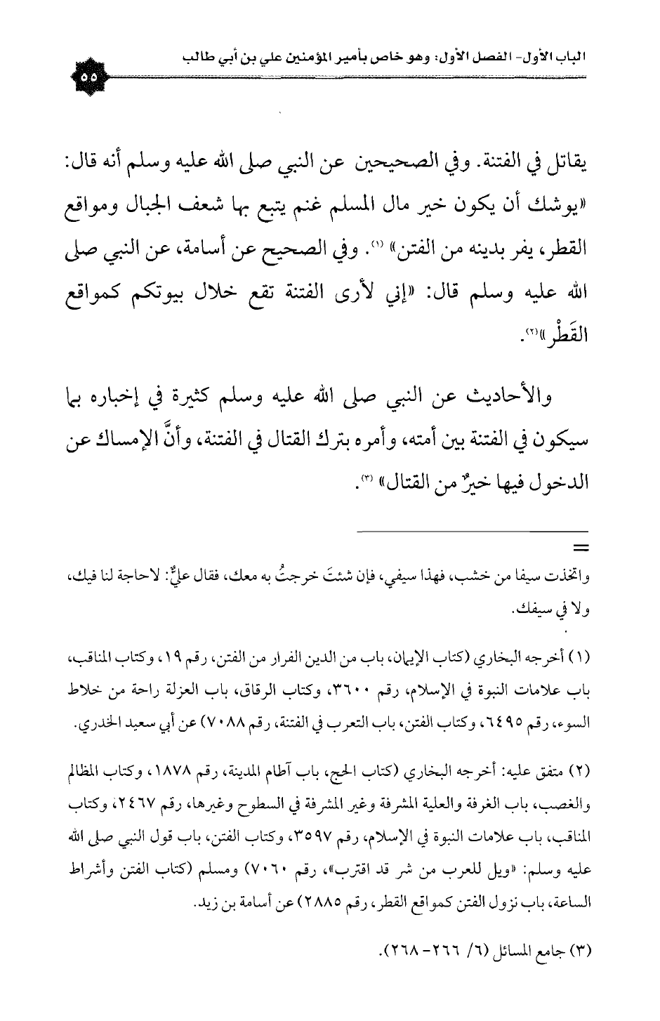 والأحاديث عن النبي صلى الله عليه وسلم كثيرة في إخباره بما سيكون في الفتنة بين أمته، وأمره بترك القتال في الفتنة، وأنَّ الإمساك عن الدخول فيها خيرٌ من القتال» (¬٣).