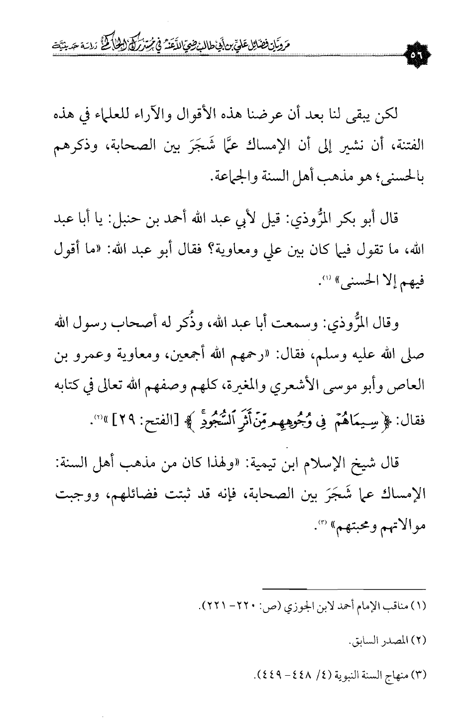وقال المرُّوذي: وسمعت أبا عبدالله، وذُكر له أصحاب رسول الله صلى الله عليه وسلم، فقال: «رحمهم الله أجمعين، ومعاوية وعمرو بن العاص وأبو موسى الأشعري والمغيرة، كلهم وصفهم الله تعالى في كتابه فقال: {سِيمَاهُمْ فِي وُجُوهِهِمْ مِنْ أَثَرِ السُّجُودِ} [الفتح: ٢٩]» (¬٢).