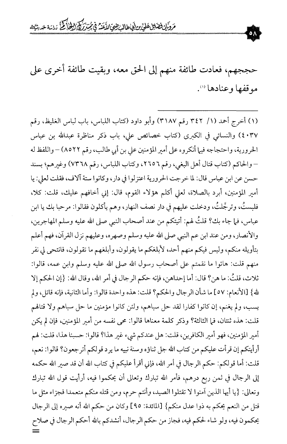 (¬١) أخرج أحمد (١/ ٣٤٢ رقم ٣١٨٧) وأبو داود (كتاب اللباس، باب لباس الغليظ، رقم ٤٠٣٧) والنسائي في الكبرى (كتاب خصائص علي، باب ذكر مناظرة عبدالله بن عباس الحرورية، واحتجاجه فيما أنكروه على أمير المؤمنين علي بن أبي طالب، رقم ٨٥٢٢) - واللفظ له - والحاكم (كتاب قتال أهل البغي، رقم ٢٦٥٦، وكتاب اللباس، رقم ٧٣٦٨) وغيرهم؛ بسند حسن عن ابن عباس قال: لما خرجت الحرورية اعتزلوا في دار، وكانوا ستة آلاف، فقلت لعلي: يا أمير المؤمنين، أبرد بالصلاة، لعلي أكلم هؤلاء القوم، قال: إني أخافهم عليك، قلت: كلا، فلبستُ، وترجَّلتُ، ودخلت عليهم في دار نصف النهار، وهم يأكلون فقالوا: مرحبا بك يا ابن عباس، فما جاء بك؟ قلتُ لهم: أتيتكم من عند أصحاب النبي صلى الله عليه وسلم المهاجرين، والأنصار، ومن عند ابن عم النبي صلى الله عليه وسلم وصهره، وعليهم نزل القرآن، فهم أعلم بتأويله منكم، وليس فيكم منهم أحد، لأبلغكم ما يقولون، وأبلغهم ما تقولون، فانتحى لي نفر منهم قلت: هاتوا ما نقمتم على أصحاب رسول الله صلى الله عليه وسلم وابن عمه، قالوا: ثلاث، قلتُ: ما هن؟ قال: أما إحداهن، فإنه حكم الرجال في أمر الله، وقال الله: {إن الحكم إلا لله} [الأنعام: ٥٧] ما شأن الرجال والحكم؟ قلت: هذه واحدة قالوا: وأما الثانية، فإنه قاتل، ولم يسب، ولم يغنم، إن كانوا كفارا لقد حل سباهم، ولئن كانوا مؤمنين ما حل سباهم ولا قتالهم قلت: هذه ثنتان، فما الثالثة؟ وذكر كلمة معناها قالوا: محى نفسه من أمير المؤمنين، فإن لم يكن أمير المؤمنين، فهو أمير الكافرين، قلت: هل عندكم شيء غير هذا؟ قالوا: حسبنا هذا، قلت: لهم أرأيتكم إن قرأت عليكم من كتاب الله جل ثناؤه وسنة نبيه ما يرد قولكم أترجعون؟ قالوا: نعم، قلت: أما قولكم: حكم الرجال في أمر الله، فإني أقرأ عليكم في كتاب الله أن قد صير الله حكمه إلى الرجال في ثمن ربع درهم، فأمر الله تبارك وتعالى أن يحكموا فيه، أرأيت قول الله تبارك وتعالى: {يا أيها الذين آمنوا لا تقتلوا الصيد، وأنتم حرم، ومن قتله منكم متعمدا فجزاء مثل ما قتل من النعم يحكم به ذوا عدل منكم} [المائدة: ٩٥] وكان من حكم الله أنه صيره إلى الرجال يحكمون فيه، ولو شاء لحكم فيه، فجاز من حكم الرجال، أنشدكم بالله أحكم الرجال في صلاح=