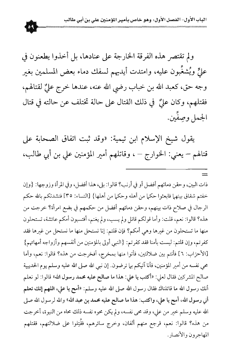 = ذات البين، وحقن دمائهم أفضل أو في أرنب؟ قالوا: بلى، هذا أفضل، وفي المرأة وزوجها: {وإن خفتم شقاق بينهما فابعثوا حكما من أهله وحكما من أهلها} [النساء: ٣٥] فنشدتكم بالله حكم الرجال في صلاح ذات بينهم، وحقن دمائهم أفضل من حكمهم في بضع امرأة؟ خرجت من هذه؟ قالوا: نعم، قلت: وأما قولكم قاتل ولم يسب، ولم يغنم، أفتسبون أمكم عائشة، تستحلون منها ما تستحلون من غيرها وهي أمكم؟ فإن قلتم: إنا نستحل منها ما نستحل من غيرها فقد كفرتم، وإن قلتم: ليست بأمنا فقد كفرتم: {النبي أولى بالمؤمنين من أنفسهم وأزواجه أمهاتهم} [الأحزاب: ٦] فأنتم بين ضلالتين، فأتوا منها بمخرج، أفخرجت من هذه؟ قالوا: نعم، وأما محي نفسه من أمير المؤمنين، فأنا آتيكم بما ترضون. إن نبي الله صلى الله عليه وسلم يوم الحديبية صالح المشركين فقال لعلي: «اكتب يا علي: هذا ما صالح عليه محمد رسول الله» قالوا: لو نعلم أنك رسول الله ما قاتلناك فقال رسول الله صلى الله عليه وسلم: «امح يا علي، اللهم إنك تعلم أني رسول الله، امح يا علي، واكتب: هذا ما صالح عليه محمد بن عبدالله» والله لرسول الله صلى الله عليه وسلم خير من علي، وقد محى نفسه، ولم يكن محوه نفسه ذلك محاه من النبوة، أخرجت من هذه؟ قالوا: نعم، فرجع منهم ألفان، وخرج سائرهم، فقُتِلوا على ضلالتهم، فقتلهم المهاجرون والأنصار.