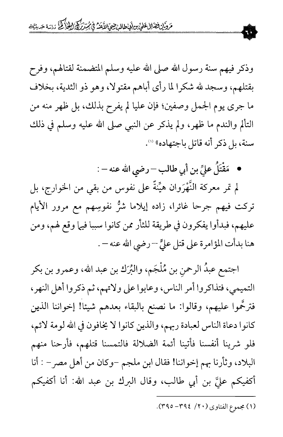 وذكر فيهم سنة رسول الله صلى الله عليه وسلم المتضمنة لقتالهم، وفرح بقتلهم، وسجد لله شكرا لما رأى أباهم مقتولا، وهو ذو الثدية، بخلاف ما جرى يوم الجمل وصفين؛ فإن عليا لم يفرح بذلك، بل ظهر منه من التألم والندم ما ظهر، ولم يذكر عن النبي صلى الله عليه وسلم في ذلك سنة، بل ذكر أنه قاتل باجتهاده» (¬١).