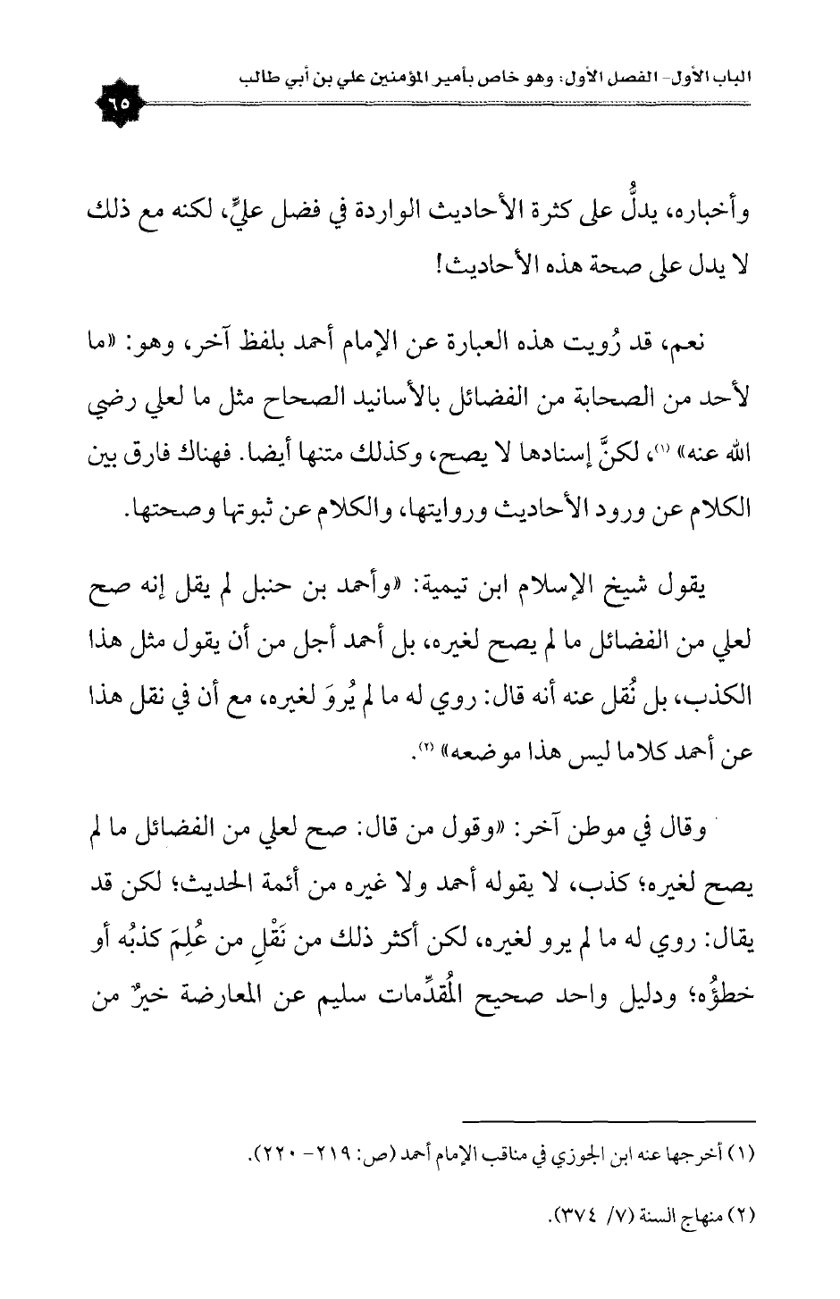 وقال في موطن آخر: «وقول من قال: صح لعلي من الفضائل ما لم يصح لغيره؛ كذب، لا يقوله أحمد ولا غيره من أئمة الحديث؛ لكن قد يقال: روي له ما لم يرو لغيره، لكن أكثر ذلك من نَقْلِ من عُلِمَ كذبُه أو خطؤُه؛ ودليل واحد صحيح المُقدِّمات سليم عن المعارضة خيرٌ من