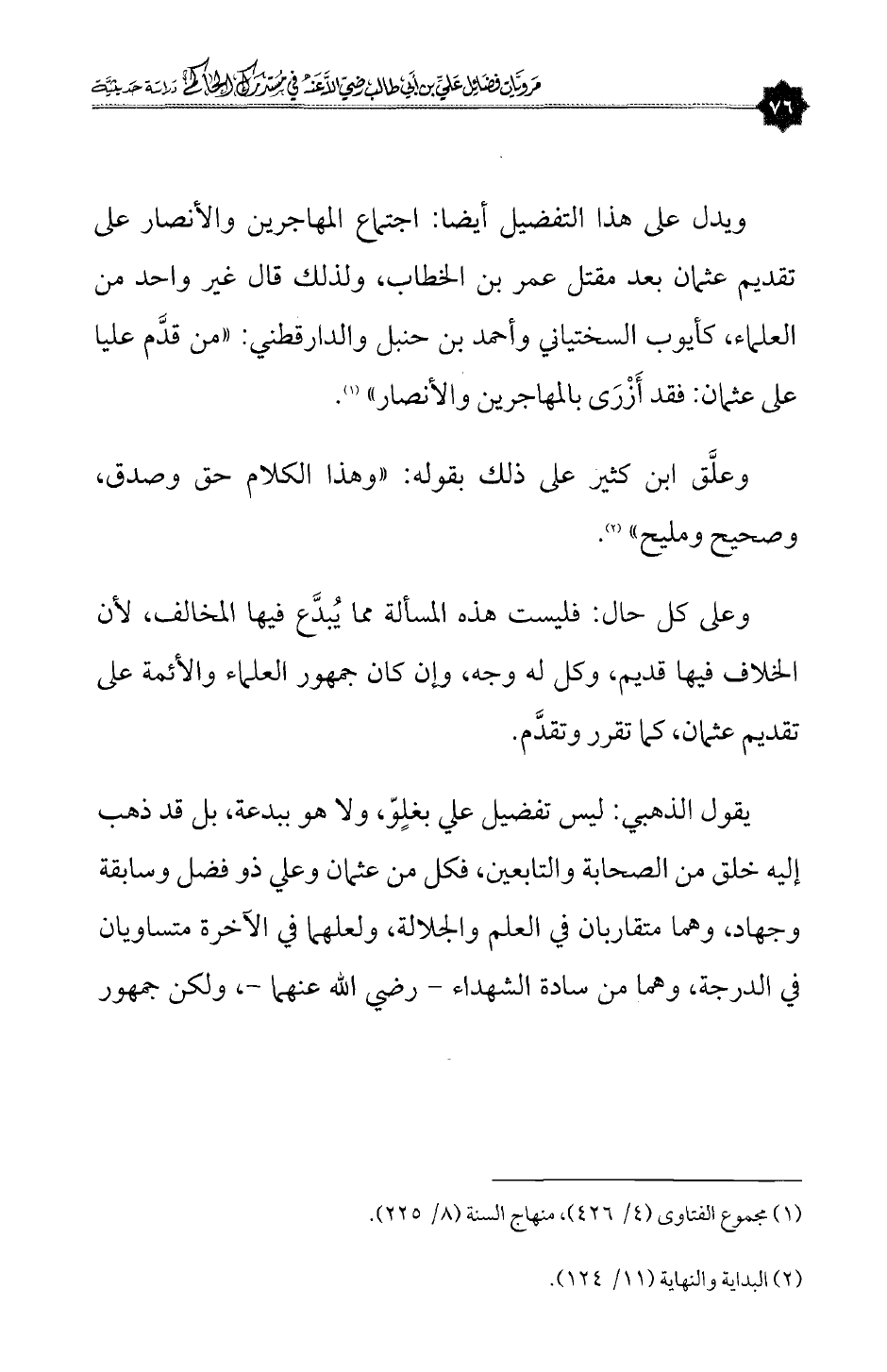 يقول الذهبي: «ليس تفضيل علي برفض، ولا هو ببدعة، بل قد ذهب إليه خلق من الصحابة والتابعين، فكل من عثمان وعلي ذو فضل وسابقة وجهاد، وهما متقاربان في العلم والجلالة، ولعلهما في