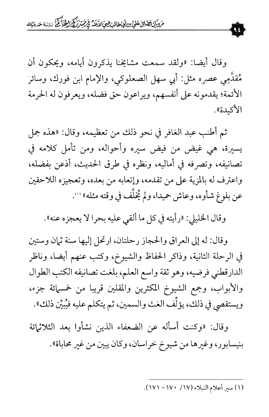 ثم أطنب عبد الغافر في نحو ذلك من تعظيمه، وقال: «هذه جمل يسيرة، هي غيض من فيض سيره