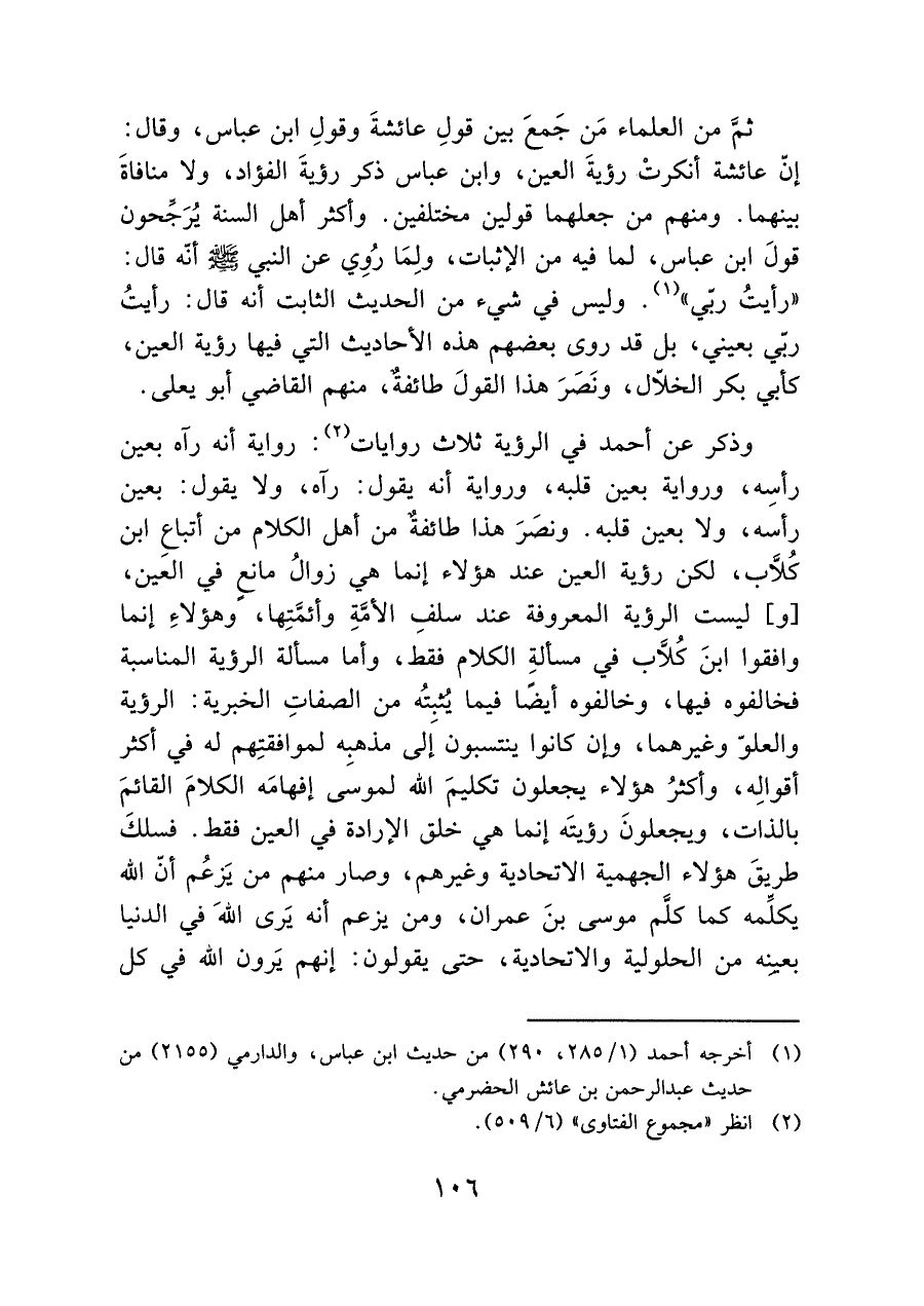 ثمَّ من العلماء مَن جَمعَ بين قولِ عائشةَ وقولِ ابن عباس، وقال: إنّ عائشة أنكرتْ رؤيةَ العين، وابن عباس ذكر رؤيةَ الفؤاد، ولا منافاةَ بينهما. ومنهم من جعلهما قولين مختلفين. وأكثر أهل السنة يُرَجِّحون قولَ ابن عباس، لما فيه من الإثبات، ولِمَا رُوِي عن النبي - صَلَّى اللَّهُ عَلَيْهِ وَسَلَّمَ - أنّه قال: "رأيتُ ربّي" (¬١). وليس في شيء من الحديث الثابت أنه قال: رأيتُ ربّي بعيني، بل قد روى بعضهم هذه الأحاديث التي فيها رؤية العين، كأبي بكر الخلاّل، ونَصَرَ هذا القولَ طائفةٌ، منم القاضي أبو يعلى.
