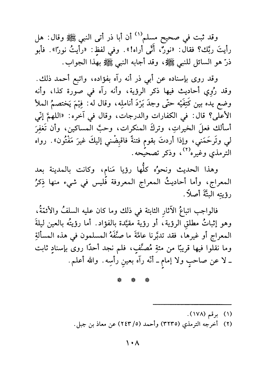 وقد ثبت في صحيح مسلم (¬١) أن أبا ذر أتى النبي - صَلَّى اللَّهُ عَلَيْهِ وَسَلَّمَ - وقال: هل رأيتَ ربَّك؟ فقال: "نورٌ، أَنى أراه! ". وفي لفظٍ: "رأيتُ نورًا". فأبو ذرّ هو السائل للنبي - صَلَّى اللَّهُ عَلَيْهِ وَسَلَّمَ -، وقد أجابه النبي - صَلَّى اللَّهُ عَلَيْهِ وَسَلَّمَ - بهذا الجواب.