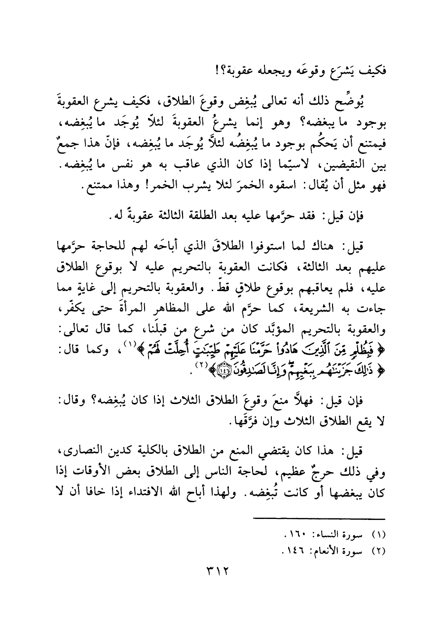 يُوضِّح ذلك أنه تعالى يُبغِض وقوعَ الطلاق، فكيف يشرع العقوبةَ بوجود ما يبغضه؟ وهو إنما يشرعُ العقوبةَ لئلاّ يُوجَد ما يُبغِضه، فيمتنع أن يَحكُم بوجود ما يُبغِضُه لئلَّا يُوجَد ما يُبغِضه، فإن هذا جمعٌ بين النقيضين، لاسيّما إذا كان الذي عاقب به هو نفس ما يُبغِضه.
