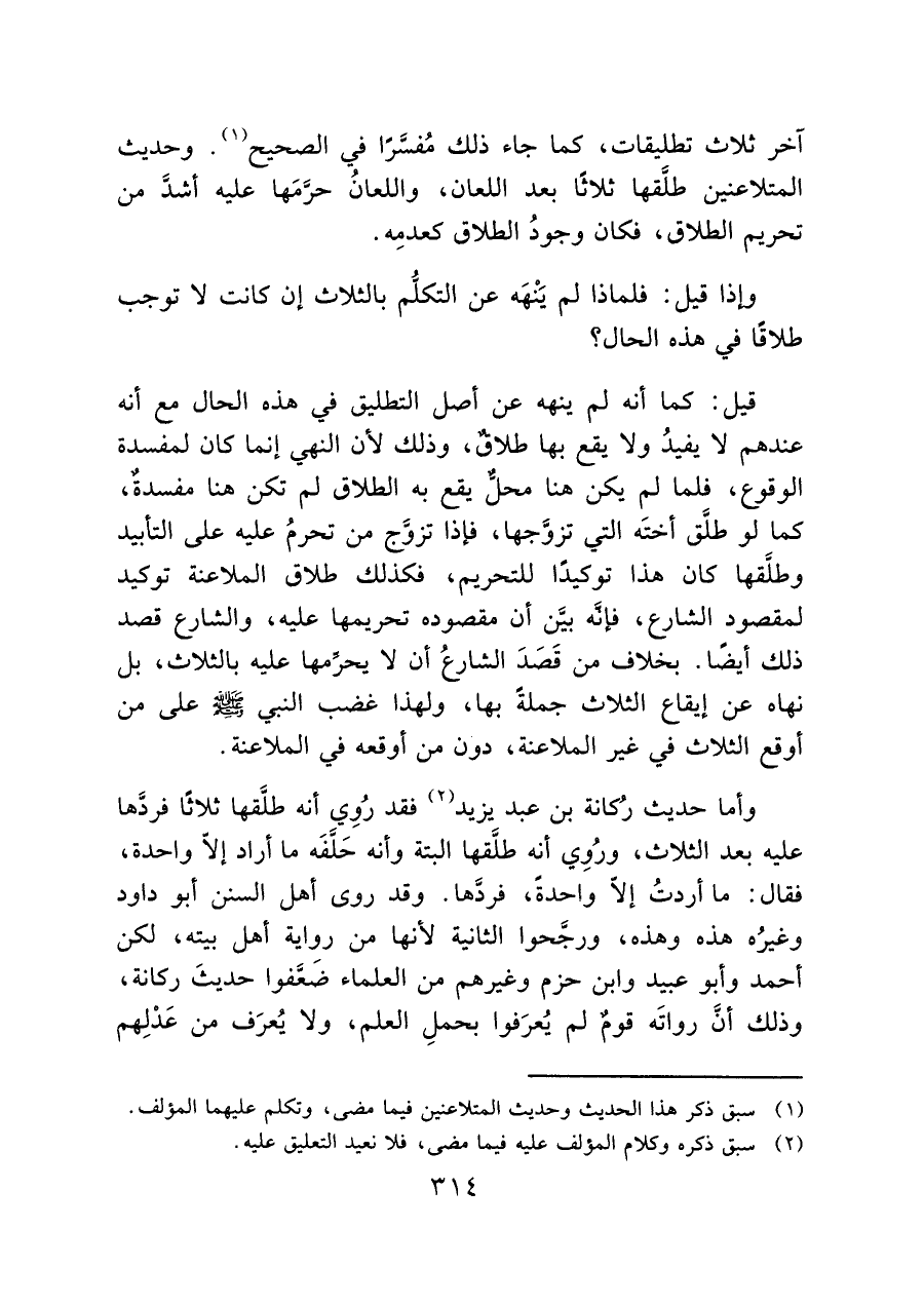 قيل: كما أنه لم ينهه عن أصل التطليق في هذه الحال مع أنه عندهم لا يفيدُ ولا يقع بها طلاقٌ، وذلك لأن النهي إنما كان لمفسدة الوقوع، فلما لم يكن هنا محلٌّ يقع به الطلاق لم تكن هنا مفسدة، كما لو طلَّق أختَه التي تزوَّجها، فإذا تزوَّج من تحرمُ عليه على التأبيد وطلَّقها كان هذا توكيدًا للتحريم، فكذلك طلاق الملاعنة توكيد لمقصود الشارع، فإنِّه بيَّن أن مقصوده تحريمها عليه، والشارع قصد ذلك أيضًا. بخلاف من قَصدَ الشارعُ أن لا يحرِّمها عليه بالثلاث، بل نهاه عن إيقاع الثلاث جملةً بها، ولهذا غضب النبي - صَلَّى اللَّهُ عَلَيْهِ وَسَلَّمَ - على من أوقع الثلاث في غير الملاعنة، دون من أوقعه في الملاعنة.