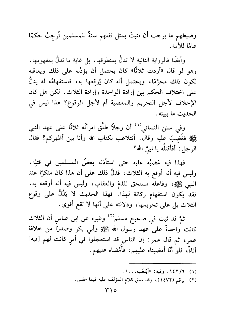 وأيضًا فالرواية الثانية لا تدلُّ بمنطوقها، بل غاية ما تدلُّ بمفهومها، وهو لو قال "أردت ثلاثًا" كان يحتمل أن يؤدِّبه على ذلك ويعاقبه لكون ذلك محرَّمًا، ويحتمل أنه كان يُوقِعها به، فاستفهامُه له يدلُّ على اختلاف الحكم بين إرادة الواحدة وإرادة الثلاث. لكن هل كان الإحلاف لأجل التحريم والمعصية أم لأجل الوقوع؟ هذا ليس في الحديث ما يبينه.