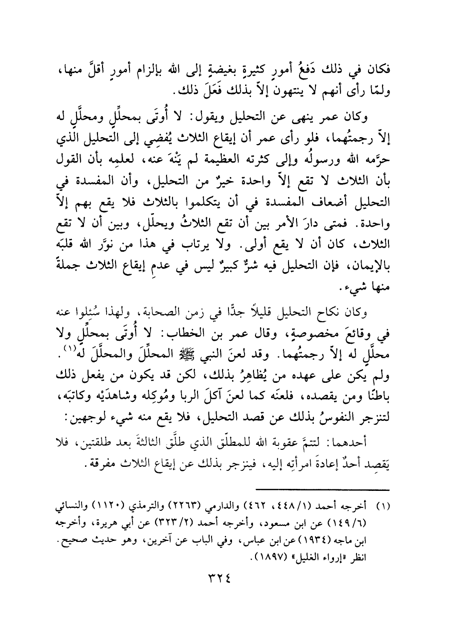 وكان عمر ينهى عن التحليل ويقول: لا أُوتَى بمحلِّل ومحلَّل له إلاّ رجمتُهما، فلو رأى عمر أن إيقاع الثلاث يُفضِي إلى التحليل الذي حرَّمه الله ورسولُه وإلى كثرته العظيمة لم يَنْهَ عنه، لعلمِه بأن القول بأن الثلاث لا تقع إلاّ واحدة خير من التحليل، وأن المفسدة في التحليل أضعاف المفسدة في أن يتكلموا بالثلاث فلا يقع بهم إلاّ واحدة. فمتى دارَ الأمر بين أن تقع الثلاثُ ويحلل، وبين أن لا تقع الثلاث، كان أن لا يقع أولى. ولا يرتاب في هذا من نوَّر الله قلبَه بالإيمان، فإن التحليل فيه شرٌّ كبيرٌ ليس في عدمِ إيقاع الثلاث جملةً منها شيء.