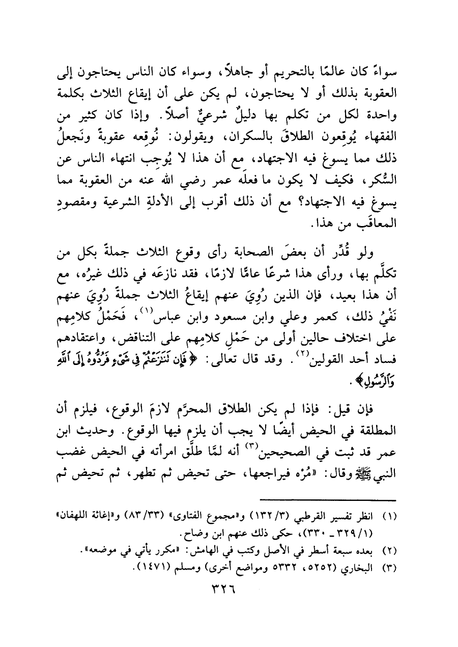 سواءً كان عالمًا بالتحريم أو جاهلاً، وسواء كان الناس يحتاجون إلى العقوبة بذلك أو لا يحتاجون، لم يكن على أن إيقاع الثلاث بكلمة واحدة لكل من تكلم بها دليل شرعيٌّ أصلاً. وإذا كان كثير من الفقهاء يُوقِعون الطلاقَ بالسكران، ويقولون: نُوقِعه عقوبة ونَجعلُ ذلك مما يسوغ فيه الاجتهاد، مع أن هذا لا يُوجب انتهاء الناس عن الشُكر، فكيف لا يكون ما فعلَه عمر رضي الله عنه من العقوبة مما يسوغ فيه الاجتهاد؟ مع أن ذلك أقرب إلى الأدلةِ الشرعية ومقصودِ المعاقب من هذا.