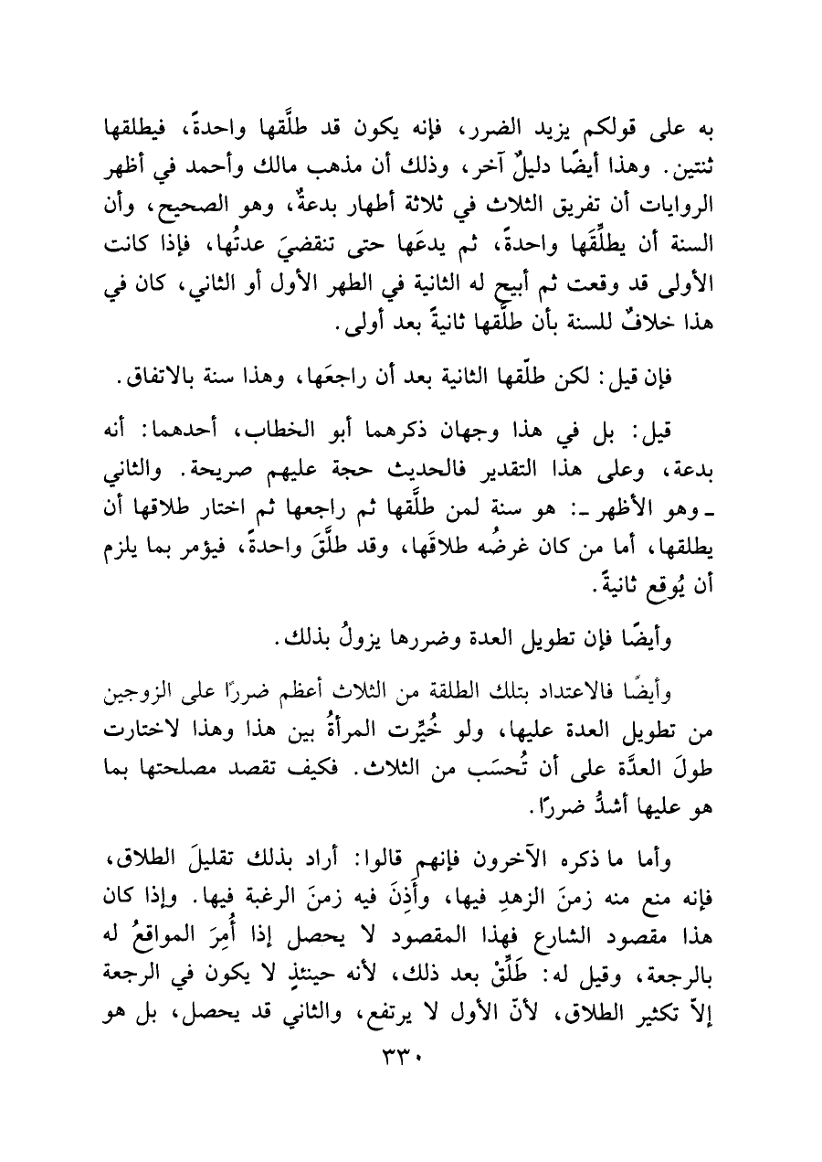 به على قولكم يزيد الضرر، فإنه يكون قد طلَّقها واحدةً، فيطلقها ثنتين. وهذا أيضًا دليل آخر، وذلك أن مذهب مالك وأحمد في أظهر الروايات أن تفريق الثلاث في ثلاثة أطهار بدعة، وهو الصحيح، وأن السنة أن يطلقَها واحدةً، ثم يدعَها حتى تنقضيَ عدتُها، فإذا كانت الأولى قد وقعت ثم أبيح له الثانية في الطهر الأول أو الثاني، كان في هذا. خلاف للسنة بأن طلقها ثانيةً بعد أولى.