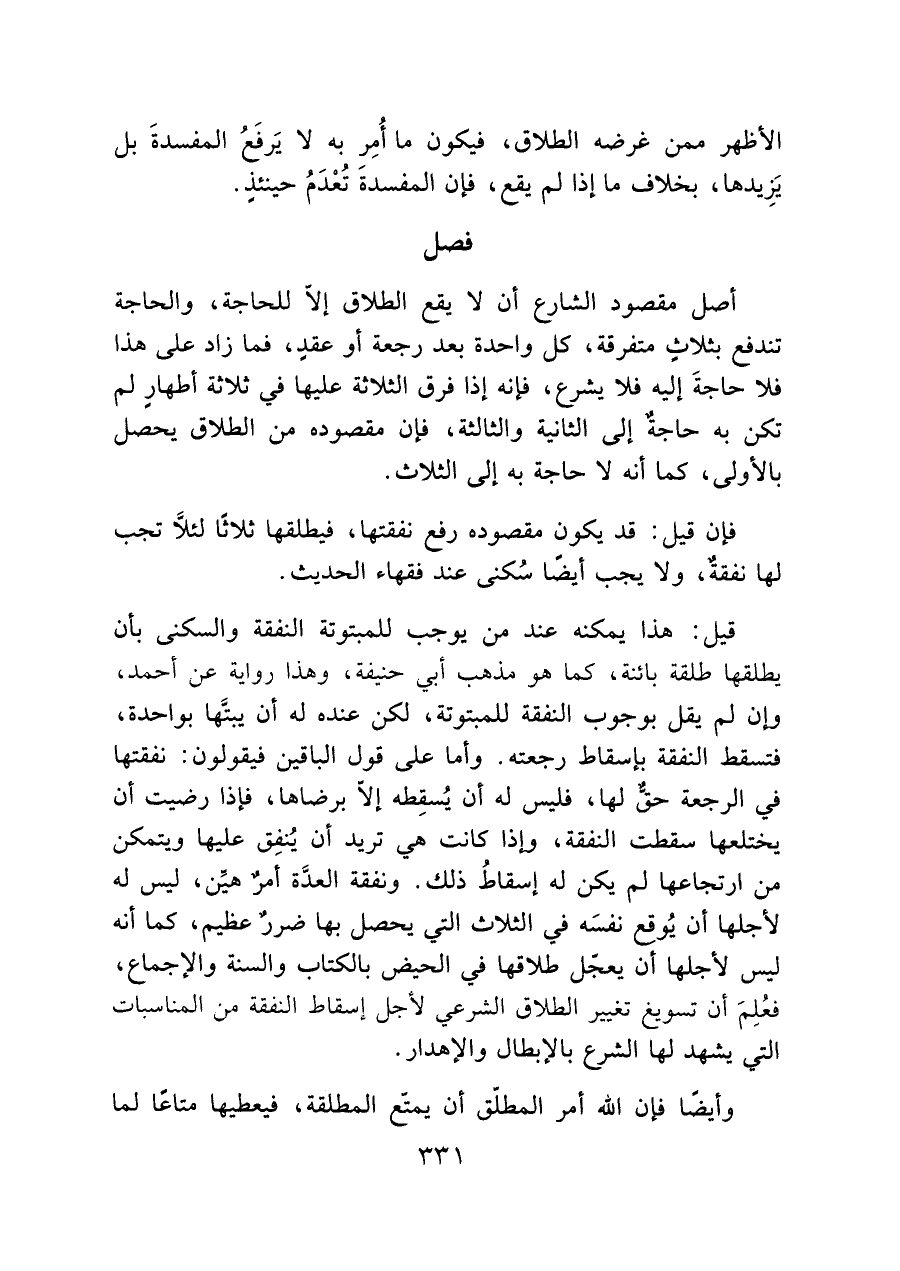 قيل: هذا يمكنه عند من يوجب للمبتوتة النفقة والسكنى بأن يطلقها طلقة بائنة، كما هو مذهب أبي حنيفة، وهذا رواية عن أحمد، وإن لم يقل بوجوب النفقة للمبتوتة، لكن عنده له أن يبتَّها بواحدة، فتسقط النفقة بإسقاط رجعته. وأما على قول الباقين فيقولون: نفقتها في الرجعة حقٌّ لها، فليس له أن يُسقِطه إلاّ برضاها، فإذا رضيت أن يختلعها سقطت النفقة، وإذا كانت هي تريد أن يُنفِق عليها ويتمكن من ارتجاعها لم يكن له إسقاطُ ذلك. ونفقة العدَّة أمر هيِّن، ليس له لأجلها أن يُوقع نفسَه في الثلاث التي يحصل بها ضرر عظيم، كما أنه ليس لأجلها أن يعجل طلاقها في الحيض بالكتاب والسنة والإجماع، فعُلِمَ أن تسويغ تغيير الطلاق الشرعي لأجل إسقاط النفقة من المناسبات التي يشهد لها الشرع بالإبطال والإهدار.