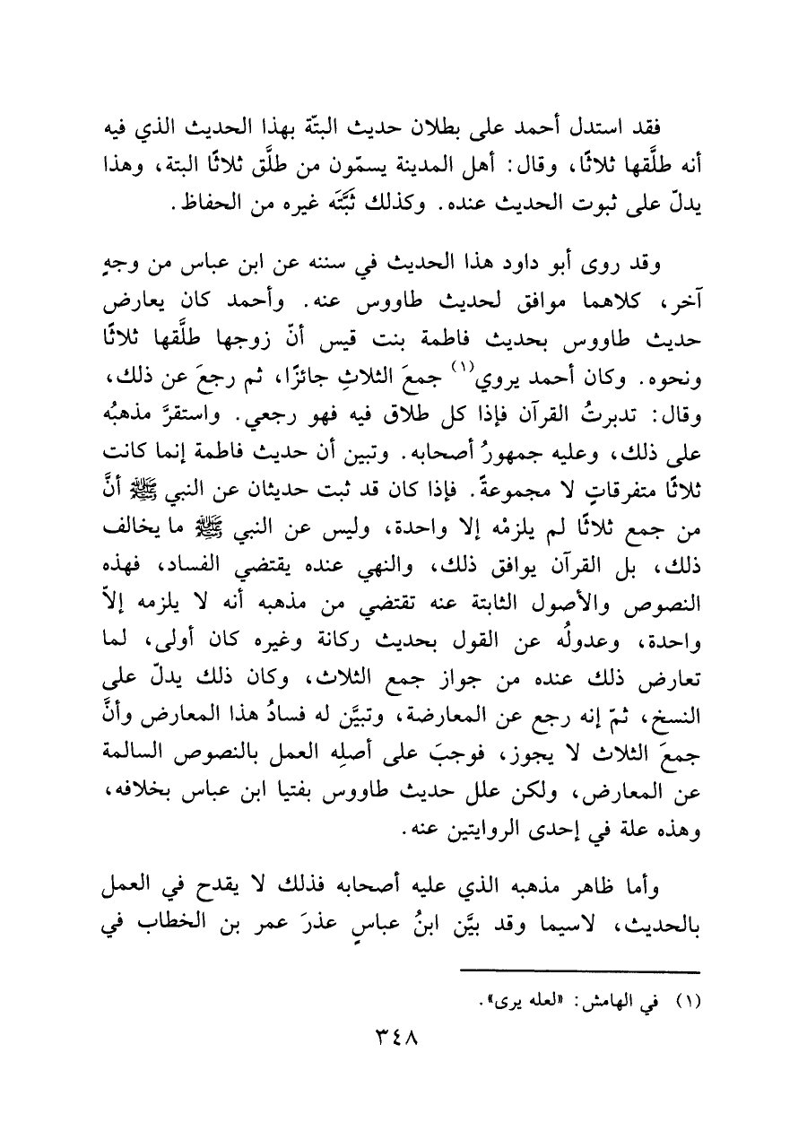 وقد روى أبو داود هذا الحديث في سننه عن ابن عباس من وجهٍ آخر، كلاهما موافق لحديث طاووس عنه. وأحمد كان يعارض حديث طاووس بحديث فاطمة بنت قيس أنّ زوجها طلَّقها ثلاثًا ونحوه. وكان أحمد يروي (¬١) جمعَ الثلاثِ جائزًا، ثم رجعَ عن ذلك، وقال: تدبرتُ القرآن فإذا كل طلاق فيه فهو رجعي. واستقرَّ مذهبُه على ذلك، وعليه جمهورُ أصحابه. وتبين أن حديث فاطمة إنما كانت ثلاثًا متفرقاتٍ لا مجموعةً. فإذا كان قد ثبت حديثان عن النبي - صَلَّى اللَّهُ عَلَيْهِ وَسَلَّمَ - أنَّ من جمع ثلاثًا لم يلزمْه إلا واحدة، وليس عن النبي - صَلَّى اللَّهُ عَلَيْهِ وَسَلَّمَ - ما يخالف ذلك، بل القرآن يوافق ذلك، والنهي عنده يقتضي الفساد، فهذه النصوص والأصول الثابتة عنه تقتضي من مذهبه أنه لا يلزمه إلاّ واحدة، وعدولُه عن القول بحديث ركانة وغيره كان أولى، لما تعارض ذلك عنده من جواز جمع الثلاث، وكان ذلك يدلّ على النسخ، ثمّ إنه رجع عن المعارضة، وتبيَّن له فسادُ هذا المعارض وأنَّ جمعَ الثلاث لا يجوز، فوجبَ على أصلِه العمل بالنصوص السالمة عن المعارض، ولكن علل حديث طاووس بفتيا ابن عباس بخلافه، وهذه علة في إحدى الروايتين عنه.