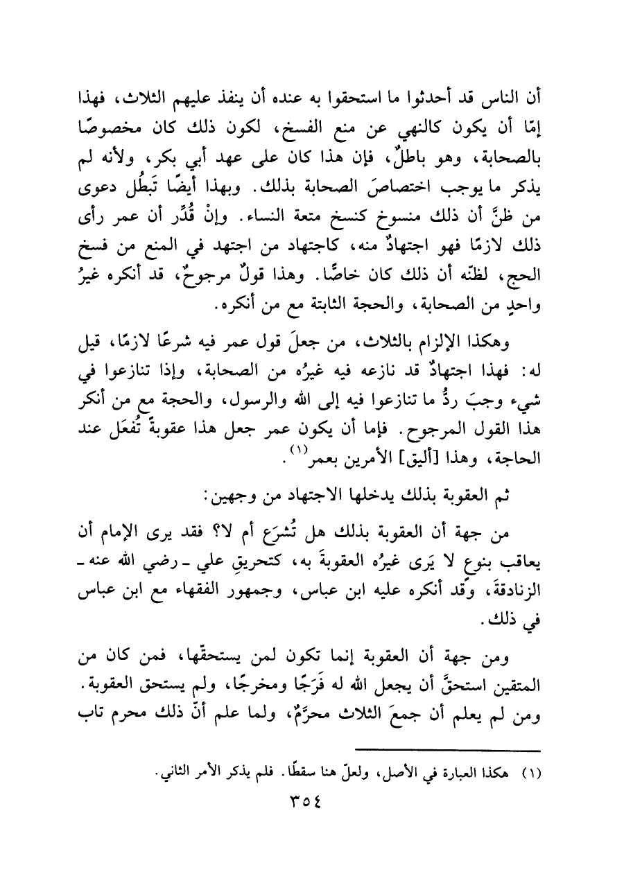 أن الناس قد أحدثوا ما استحقوا به عنده أن ينفذ عليهم الثلاث، فهذا إمّا أن يكون كالنهي عن منع الفسخ، لكون ذلك كان مخصوصًا بالصحابة، وهو باطلٌ، فإن هذا كان على عهد أبي بكر، ولأنه لم يذكر ما يوجب اختصاصَ الصحابة بذلك. وبهذا أيضًا تَبطُل دعوى من ظنَّ أن ذلك منسوخ كنسخ متعة النساء. وإنْ قُدِّر أن عمر رأى ذلك لازمًا فهو اجتهادٌ منه، كاجتهاد من اجتهد في المنع من فسخ الحج، لظنّه أن ذلك كان خاصًّا. وهذا قولٌ مرجوحٌ، قد أنكره غيرُ واحدٍ من الصحابة، والحجة الثابتة مع من أنكره.