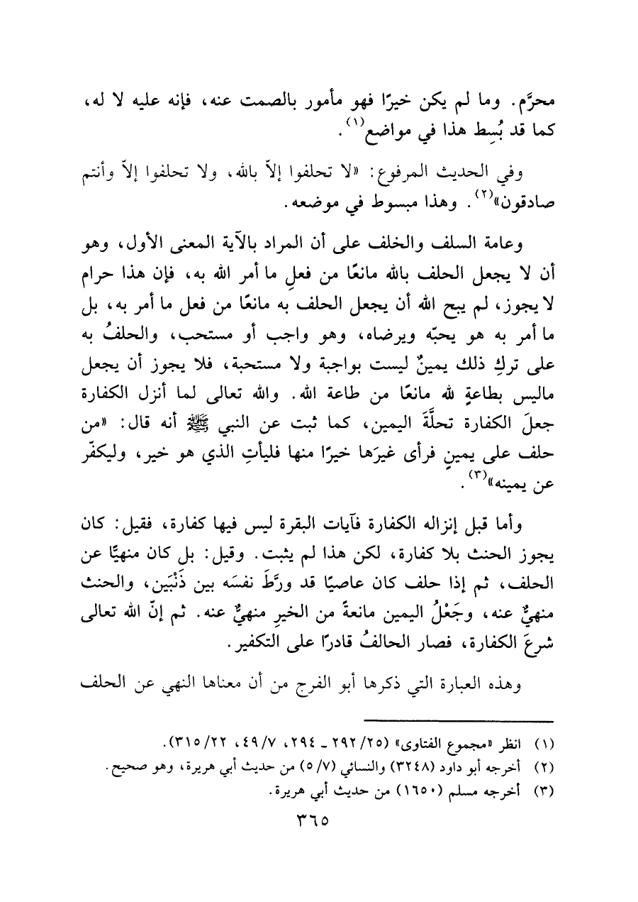 وعامة السلف والخلف على أن المراد بالآية المعنى الأول، وهو أن لا يجعل الحلف بالله مانعًا من فعلِ ما أمر الله به، فإن هذا حرام لا يجوز، لم يبح الله أن يجعل الحلف به مانعًا من فعل ما أمر به، بل ما أمر به هو يحبّه ويرضاه، وهو واجب أو مستحب، والحلفُ به على تركِ ذلك يمين ليست بواجبة ولا مستحبة، فلا يجوز أن يجعل ماليس بطاعةٍ لله مانعًا من طاعة الله. والله تعالى لما أنزل الكفارة جعلَ الكفارة تحلَّةَ اليمين، كما ثبت عن النبي - صَلَّى اللَّهُ عَلَيْهِ وَسَلَّمَ - أنه قال: "من حلف على يمينٍ فرأى غيرَها خيرًا منها فليأتِ الذي هو خير، وليكفر عن يمينه" (¬٣).