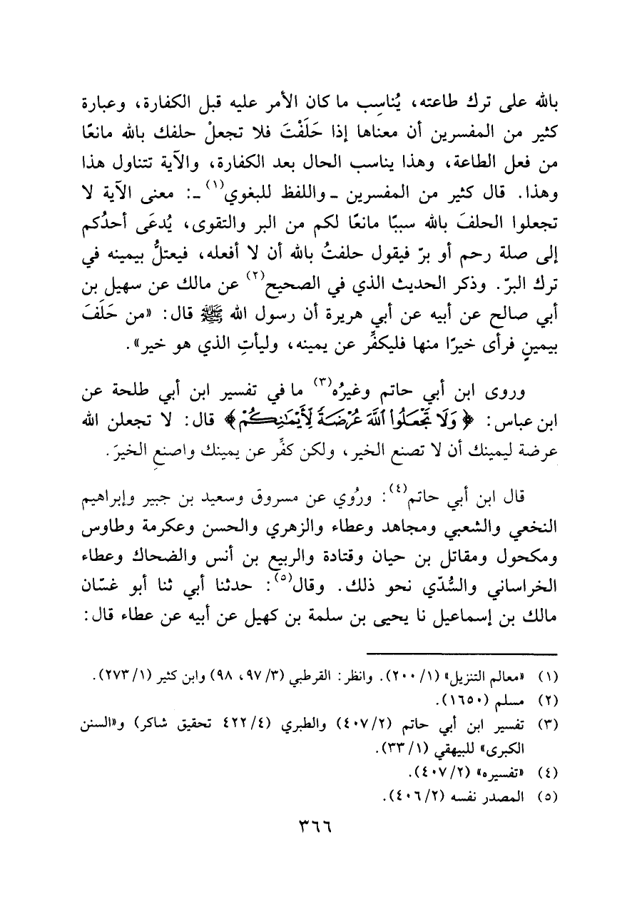 بالله على ترك طاعته، يُناسِب ما كان الأمر عليه قبل الكفارة، وعبارة كثير من المفسرين أن معناها إذا حَلَفْتَ فلا تجعلْ حلفك بالله مانعًا من فعل الطاعة، وهذا يناسب الحال بعد الكفارة، والآية تتناول هذا وهذا. قال كثير من المفسرين - واللفظ للبغوي (¬١) -: معنى الآية لا تجعلوا الحلفَ بالله سببًا مانعًا لكم من البر والتقوى، يُدعَى أحدُكم إلى صلة رحم أو برً فيقول حلفتُ بالله أن لا أفعله، فيعتل بيمينه في ترك البرّ. وذكر الحديث الذي في الصحيح (¬٢) عن مالك عن سهيل بن أبي صالح عن أبيه عن أبي هريرة أن رسول الله - صَلَّى اللَّهُ عَلَيْهِ وَسَلَّمَ - قال: "من حَلَفَ بيمينٍ فرأى خيرًا منها فليكفر عن يمينه، وليأتِ الذي هو خير".