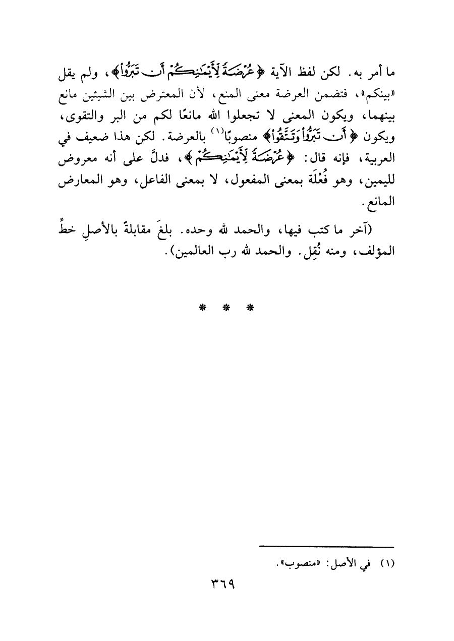 ما أمر به. لكن لفظ الآية (وَلا تَجْعَلُوا اللَّهَ عُرْضَةً لِأَيْمَانِكُمْ أَنْ تَبَرُّوا)، ولم يقل "بينكم"، فتضمن العرضة معنى المنع، لأن المعترض بين الشيئين مانع بينهما، ويكون المعنى لا تجعلوا الله مانعًا لكم من البر والتقوى، ويكون (أَنْ تَبَرُّوا وَتَتَّقُوا) منصوبًا (¬١) بالعرضة. لكن هذا ضعيف في العربية، فإنه قال: (عُرْضَةً لِأَيْمَانِكُمْ)، فدلَّ على أنه معروض لليمين، وهو فُعْلَة بمعنى المفعول، لا بمعنى الفاعل، وهو المعارض المانع.