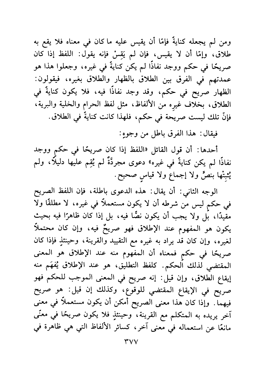 ومن لم يجعله كنايةَ فإمّا أن يقيس عليه ما كان في معناه فلا يقع به طلاق، وإمّا أن لا يقيس، فإن لم يَقِسْ فإنه يقول: اللفظ إذا كان صريحًا في حكم ووجد نفاذًا لم يكن كنايةً في غيره، وجعلوا هذا هو عمدتهم في الفرق بين الطلاق بالظهار والطلاق بغيره، فيقولون: الظهار صريح في حكم، وقد وجد نفاذًا فيه، فلا يكون كنايةً في الطلاق، بخلاف غيرِه من الألفاظ، مثل لفظ الحرام والخلية والبرية، فإن تلك ليست صريحة في حكم، فلهذا كانت كنايةً في الطلاق.